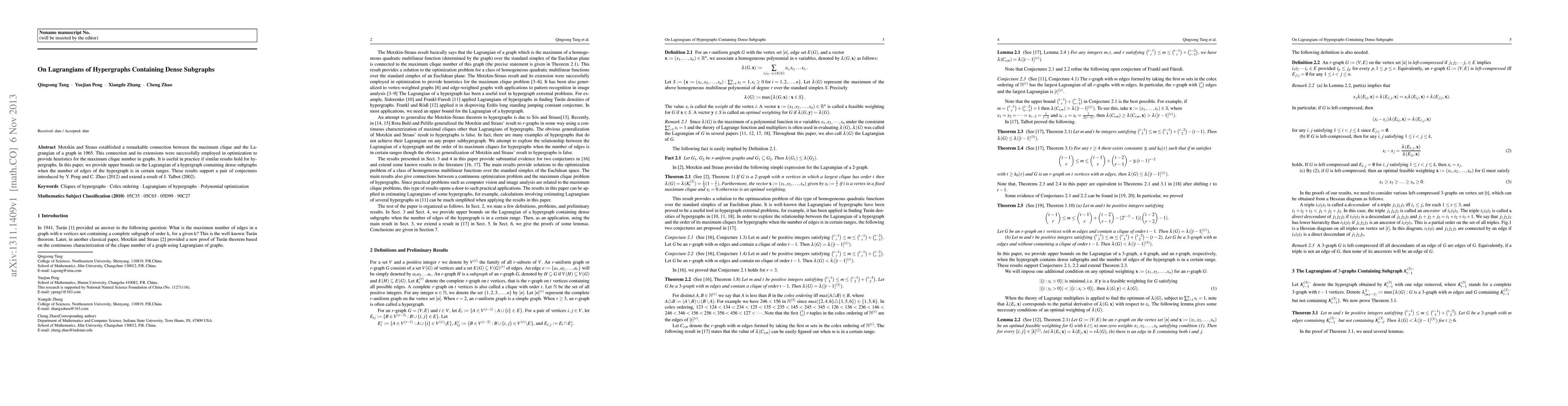 Motzkin and Straus established a remarkable connection between the maximum clique and the Lagrangian of a graph in 1965. This connection and its extensions were successfully employed in optimization to provide heuristics for the maximum clique number in graphs. It is useful in practice if similar results hold for hypergraphs. In this paper, we provide upper bounds on the Lagrangian of a hypergraph containing dense subgraphs when the number of edges of the hypergraph is in certain ranges. These results support a pair of conjectures introduced by Y. Peng and C. Zhao (2012) and extend a result of J. Talbot (2002). \keywords{Cliques of hypergraphs \and Colex ordering \and Lagrangians of hypergraphs \and Polynomial optimization}