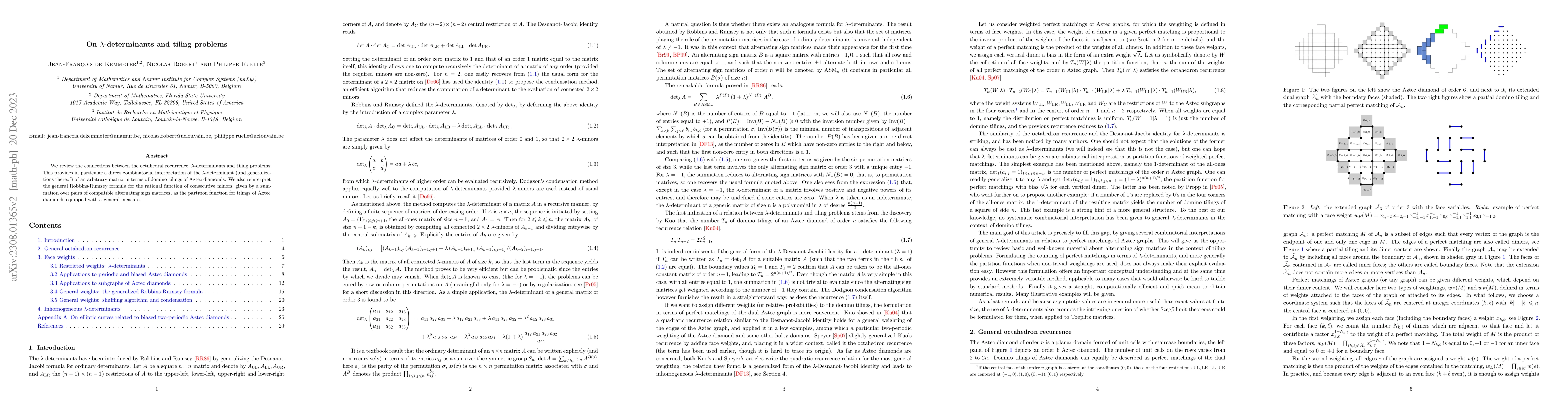 We review the connections between the octahedral recurrence, $\lambda$-determinants and tiling problems. This provides in particular a direct combinatorial interpretation of the $\lambda$-determinant (and generalizations thereof) of an arbitrary matrix in terms of domino tilings of Aztec diamonds. We also reinterpret the general Robbins-Rumsey formula for the rational function of consecutive minors, given by a summation over pairs of compatible alternating sign matrices, as the partition function for tilings of Aztec diamonds equipped with a general measure.