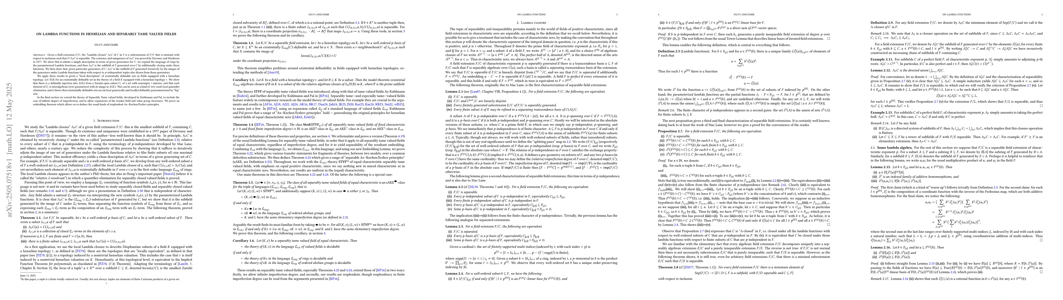 Given a field extension $F/C$, the ``Lambda closure'' $\Lambda_{F}C$ of $C$ in $F$ is a subextension of $F/C$ that is minimal with respect to inclusion such that $F/\Lambda_{F}C$ is separable. The existence and uniqueness of $\Lambda_{F}C$ was proved by Deveney and Mordeson in 1977. We show that it admits a simple description in terms of given generators for $C$: we expand the language of rings by the parameterized Lambda functions, and then $\Lambda_{F}C$ is the subfield of $F$ generated over $C$ by additionally closing under these functions. We then show that, given particular generators of $C$, $\Lambda_{F}C$ is the subfield of $F$ generated iteratively by the images of the generators under Lambda functions taken with respect to $p$-independent tuples also drawn from those generators. We apply these results to given a ``local description'' of existentially definable sets in fields equipped with a henselian topology. Let $X(K)$ be an existentially definable set in the theory of a field $K$ equipped with a henselian topology $\tau$. We show that there is a definable injection into $X(K)$ from a Zariski-open subset $U_{1}^{\circ}$ of a set with nonempty $\tau$-interior, and that each element of $U_{1}^{\circ}$ is interalgebraic (over parameters) with its image in $X(K)$. This can be seen as a kind of {\em very weak local quantifier elimination}, and it shows that existentially definable sets are (at least generically and locally) definably pararameterized by ``big'' sets. In the final section we extend the theory of separably tame valued fields, developed by Kuhlmann and Pal, to include the case of infinite degree of imperfection, and to allow expansions of the residue field and value group structures. We prove an embedding theorem which allows us to deduce the usual kinds of resplendent Ax--Kochen/Ershov principles.