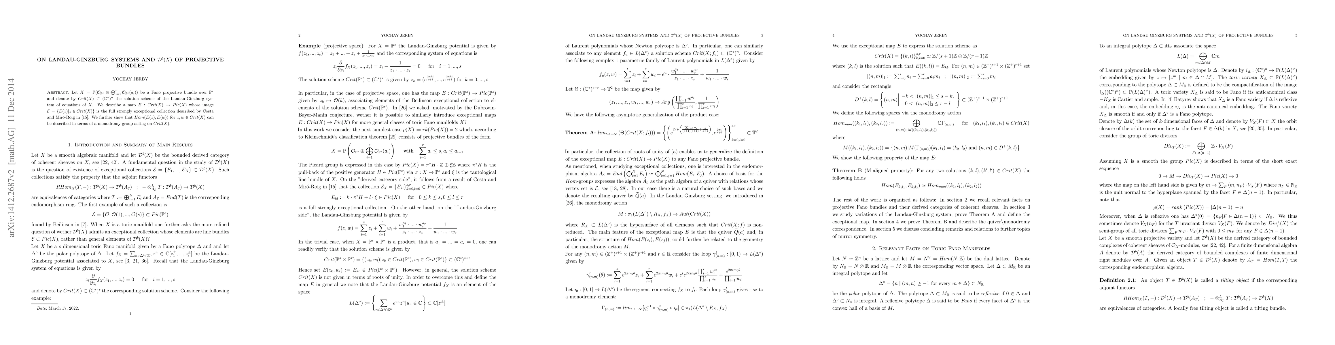 Let $X=\mathbb{P}(\mathcal{O}_{\mathbb{P}^s} \oplus \bigoplus_{i=1}^r \mathcal{O}_{\mathbb{P}^s}(a_i))$ be a Fano projective bundle over $\mathbb{P}^s$ and denote by $Crit(X) \subset (\mathbb{C}^{\ast})^n$ the solution scheme of the Landau-Ginzburg system of equations of $X$. We describe a map $E : Crit(X) \rightarrow Pic(X)$ whose image $\mathcal{E}= \{E(z) | z \in Crit(X) \}$ is the full strongly exceptional collection on $X$ found by Costa and Mir$\acute{\textrm{o}}$-Roig. We further show that $Hom(E(z),E(w))$ for $z,w \in Crit(X)$ can be described in terms of a monodromy group acting on $Crit(X)$.