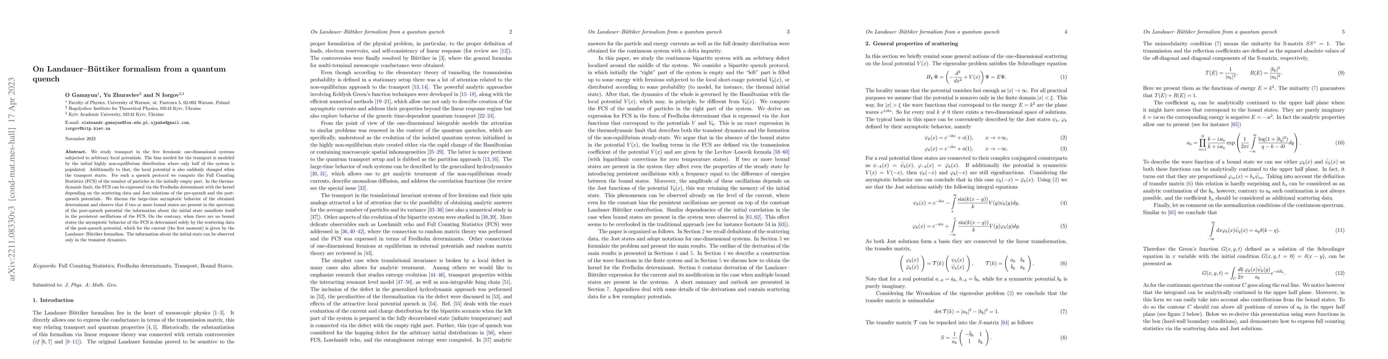 We study transport in the free fermionic one-dimensional systems subjected to arbitrary local potentials. The bias needed for the transport is modeled by the initial highly non-equilibrium distribution where only half of the system is populated. Additionally to that, the local potential is also suddenly changed when the transport starts. For such a quench protocol we compute the Full Counting Statistics (FCS) of the number of particles in the initially empty part. In the thermodynamic limit, the FCS can be expressed via the Fredholm determinant with the kernel depending on the scattering data and Jost solutions of the pre-quench and the post-quench potentials. We discuss the large-time asymptotic behavior of the obtained determinant and observe that if two or more bound states are present in the spectrum of the post-quench potential the information about the initial state manifests itself in the persistent oscillations of the FCS. On the contrary, when there are no bound states the asymptotic behavior of the FCS is determined solely by the scattering data of the post-quench potential, which for the current (the first moment) is given by the Landauer--B\"uttiker formalism. The information about the initial state can be observed only in the transient dynamics.