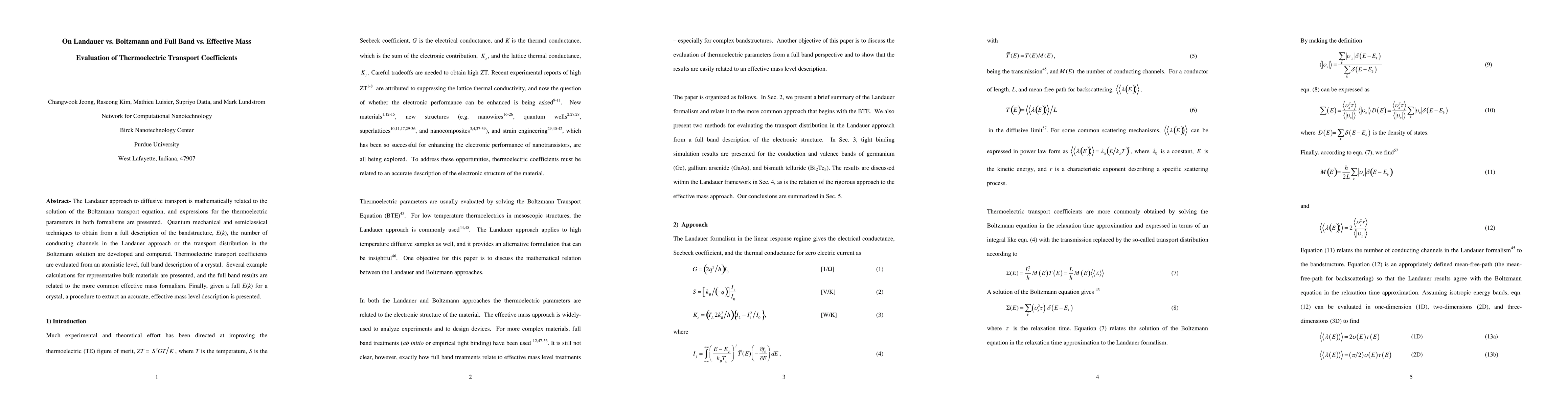The research compares the Landauer approach to diffusive transport with the Boltzmann transport equation, presenting expressions for thermoelectric parameters in both formalisms. It develops quantum mechanical and semiclassical techniques to derive the number of conducting channels in the Landauer approach or the transport distribution in the Boltzmann solution from a full bandstructure description.