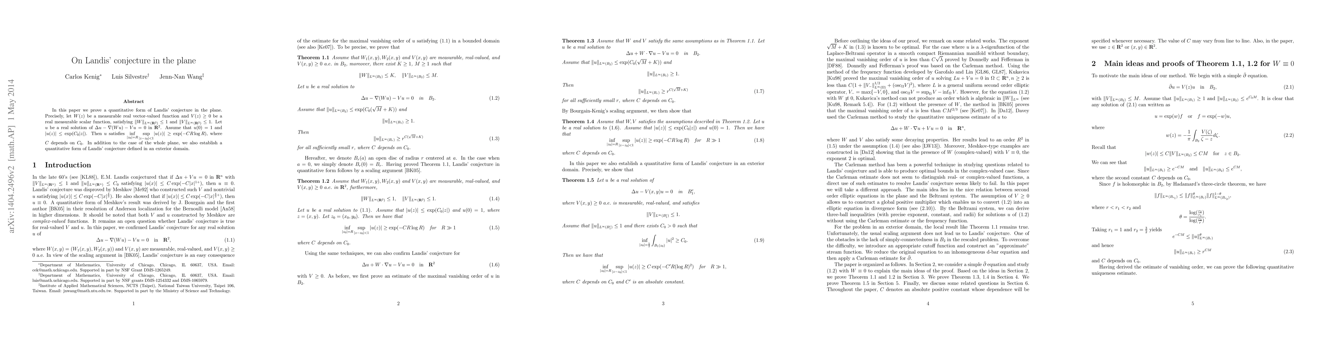 The research introduces a novel approach combining Carleman estimates with Hadamard's three-circle theorem to prove Landis' conjecture in the plane and an exterior domain.