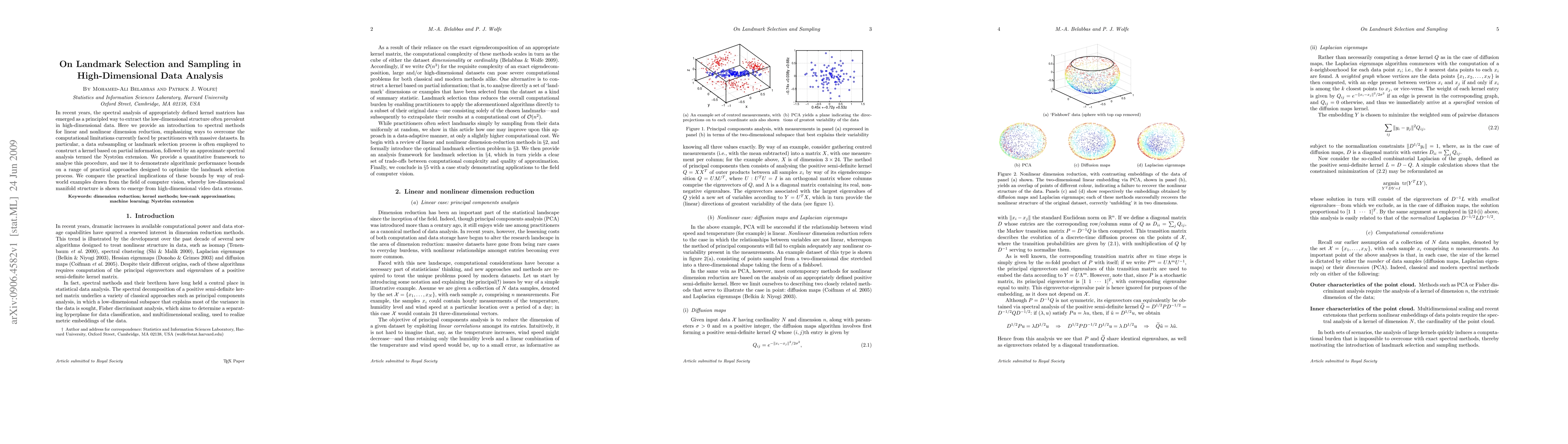 In recent years, the spectral analysis of appropriately defined kernel matrices has emerged as a principled way to extract the low-dimensional structure often prevalent in high-dimensional data. Here we provide an introduction to spectral methods for linear and nonlinear dimension reduction, emphasizing ways to overcome the computational limitations currently faced by practitioners with massive datasets. In particular, a data subsampling or landmark selection process is often employed to construct a kernel based on partial information, followed by an approximate spectral analysis termed the Nystrom extension. We provide a quantitative framework to analyse this procedure, and use it to demonstrate algorithmic performance bounds on a range of practical approaches designed to optimize the landmark selection process. We compare the practical implications of these bounds by way of real-world examples drawn from the field of computer vision, whereby low-dimensional manifold structure is shown to emerge from high-dimensional video data streams.