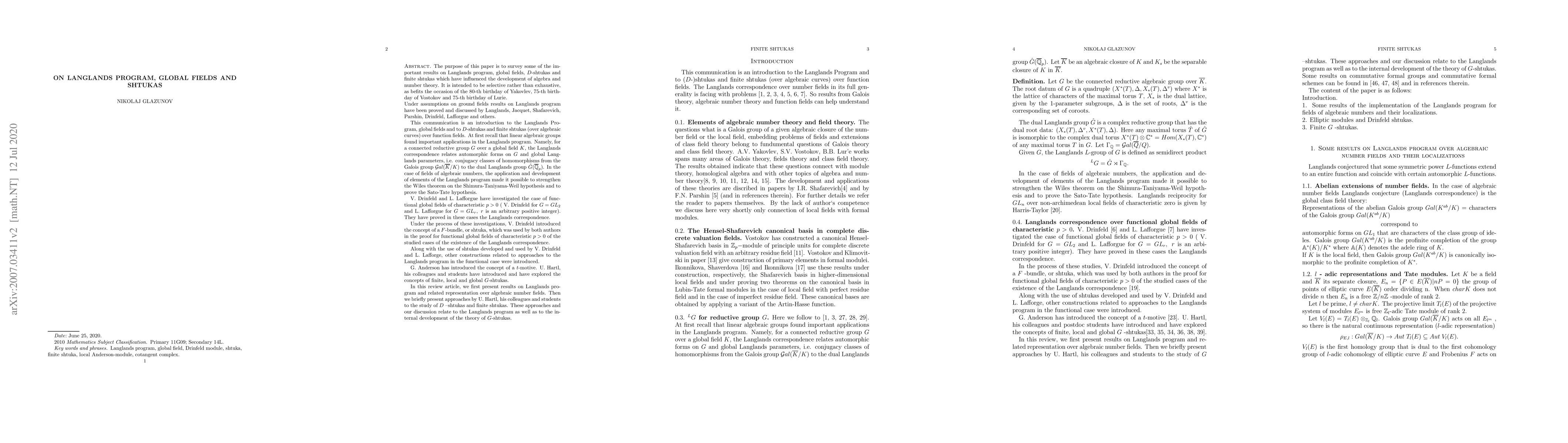 The paper provides a survey of significant results on the Langlands program, global fields, D-shtukas, and finite shtukas, focusing on contributions by Langlands, Jacquet, Shafarevich, Parshin, Drinfeld, Lafforgue, and others.