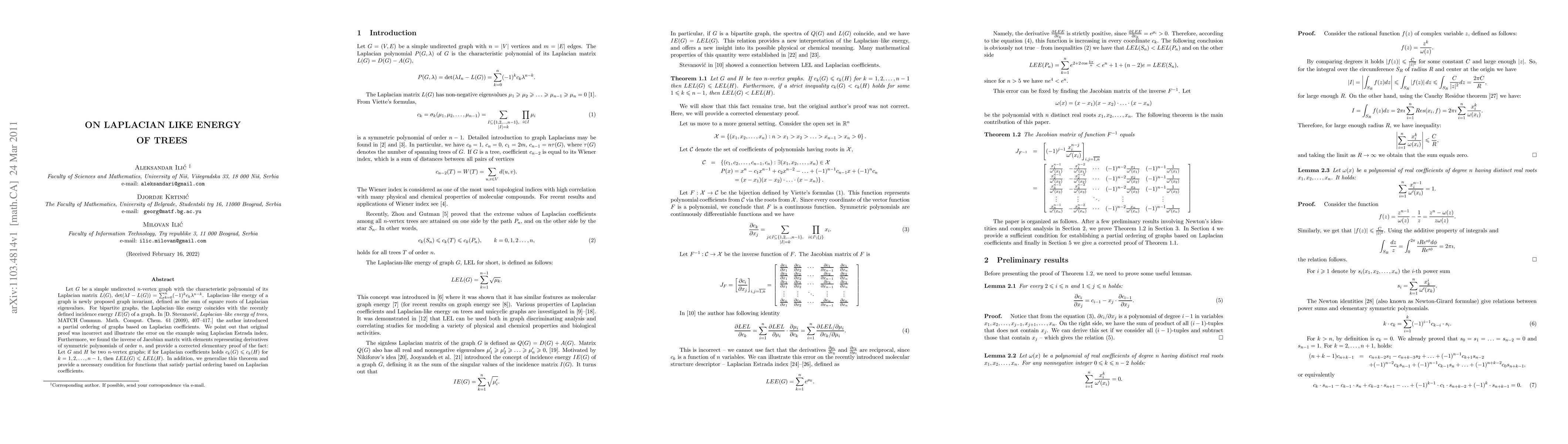 This paper corrects an error in the original proof regarding a partial ordering of graphs based on Laplacian coefficients and introduces the Laplacian-like energy (LEL) of trees. It provides a corrected proof and generalizes the theorem, establishing a necessary condition for functions that satisfy the partial ordering.