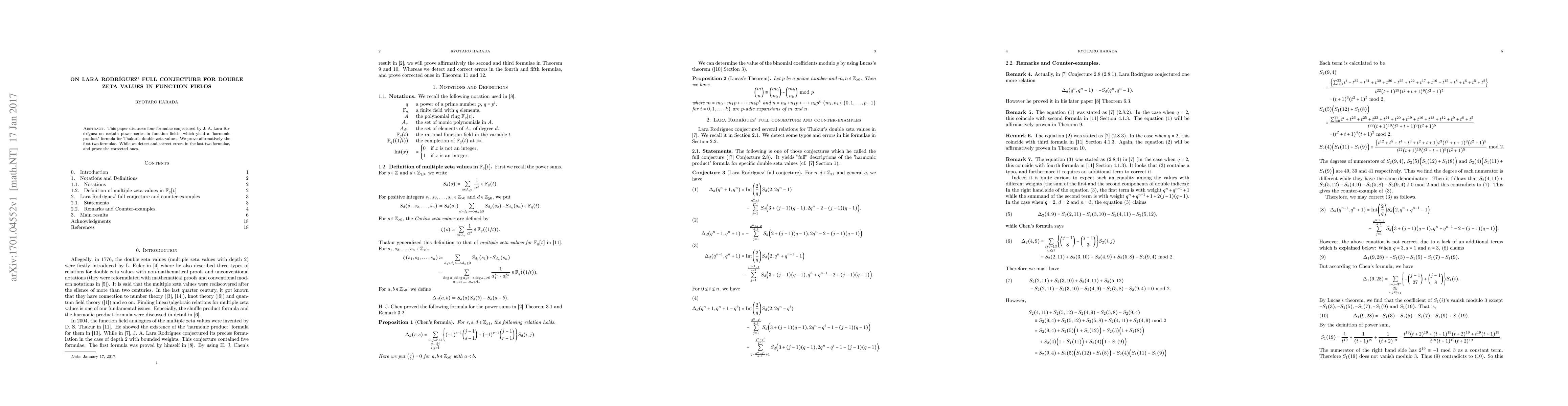 This paper discusses four formulae conjectured by J. A. Lara Rodr\'iguez on certain power series in function fields, which yield a 'harmonic product' formula for Thakur's double zeta values. We prove affirmatively the first two formulae. While we detect and correct errors in the last two formulae, and prove the corrected ones.