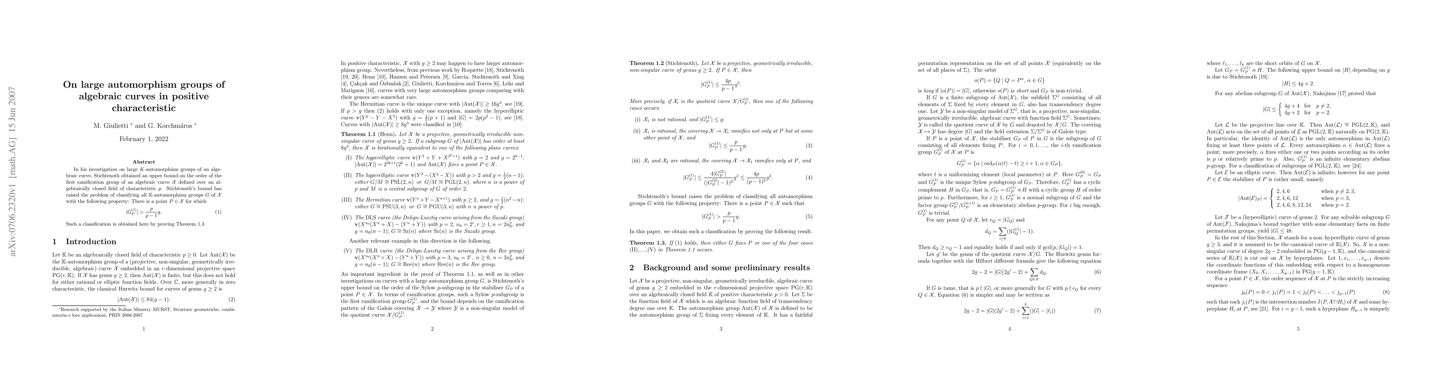This paper investigates large $K$-automorphism groups of algebraic curves in positive characteristic, focusing on classifying groups where the first ramification group at a point exceeds a specific bound. The authors prove Theorem 1.3 to achieve this classification.