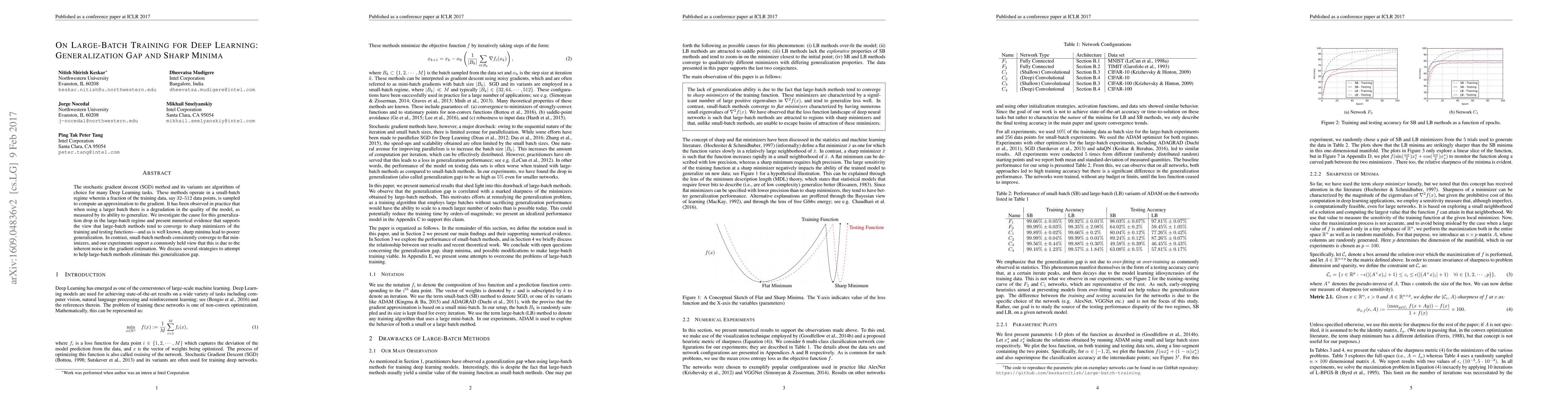 This paper investigates the generalization gap observed in large-batch training for deep learning, attributing it to the convergence of large-batch methods to sharp minimizers, which typically lead to poorer generalization compared to the flat minimizers found by small-batch methods. Strategies to mitigate this gap are also discussed.