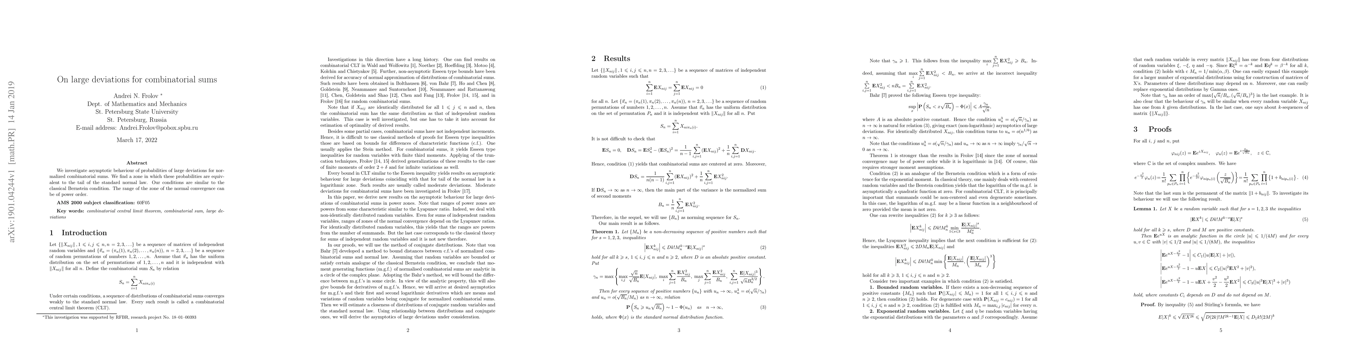 This paper examines the asymptotic behavior of probabilities associated with large deviations in normalized combinatorial sums, revealing a zone where these probabilities align with the tail of the standard normal distribution, under conditions akin to the classical Bernstein condition, with the range of normal convergence potentially being of power order.