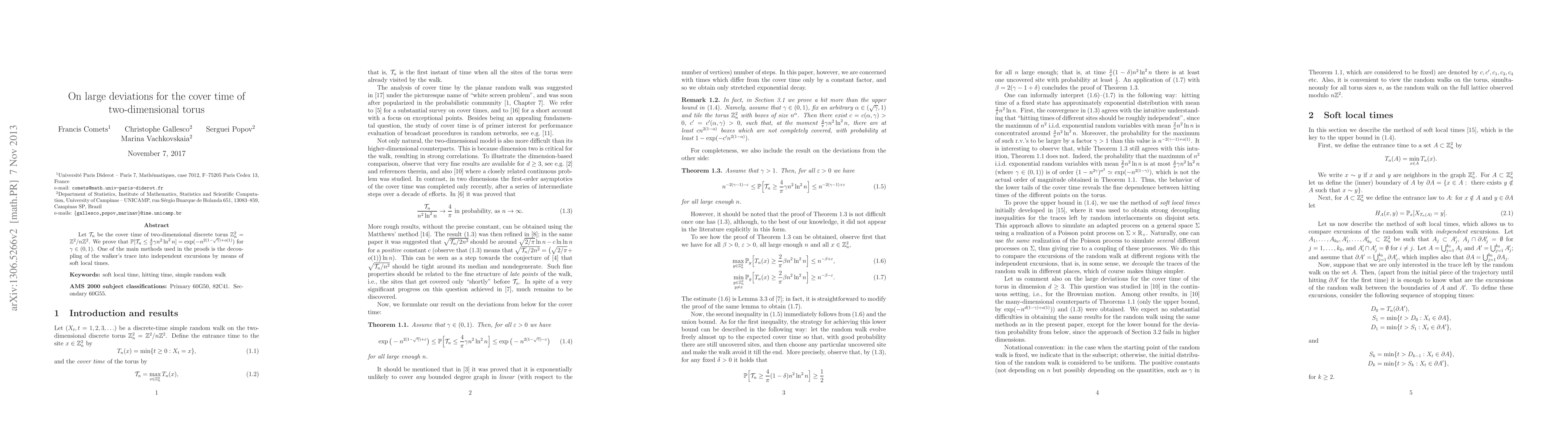 Let $\mathcal{T}_n$ be the cover time of two-dimensional discrete torus $\mathbb{Z}^2_n=\mathbb{Z}^2/n\mathbb{Z}^2$. We prove that $\mathbb{P}[\mathcal{T}_n\leq \frac{4}{\pi}\gamma n^2\ln^2 n]=\exp(-n^{2(1-\sqrt{\gamma})+o(1)})$ for $\gamma\in (0,1)$. One of the main methods used in the proofs is the decoupling of the walker's trace into independent excursions by means of soft local times.