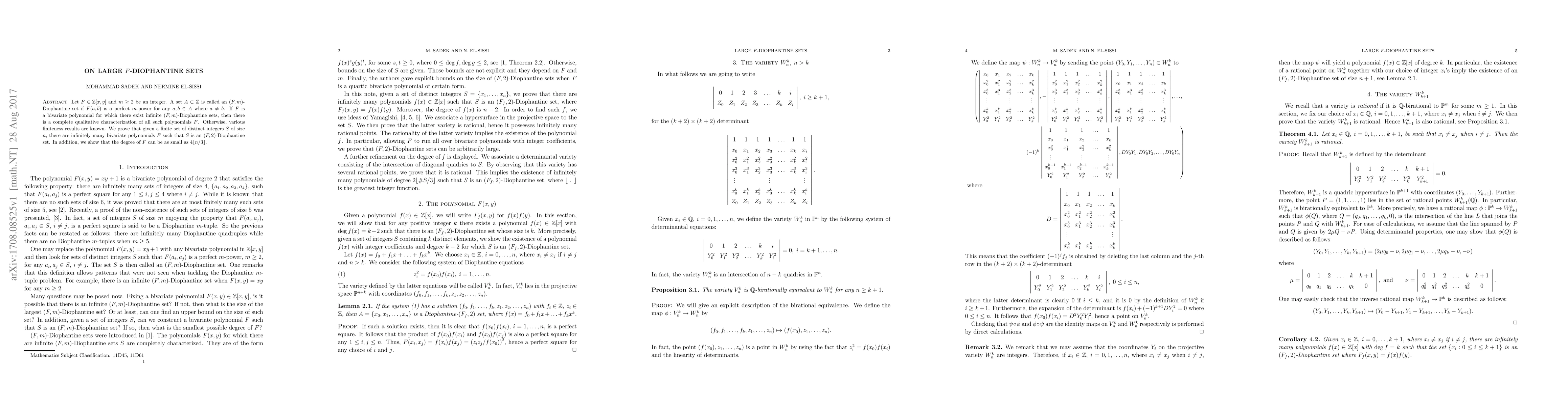 This paper characterizes polynomials $F$ that allow infinite $(F,m)$-Diophantine sets and proves that any finite set of distinct integers can be an $(F,2)$-Diophantine set for infinitely many bivariate polynomials $F$, with the smallest possible degree being $4\lfloor n/3\rfloor$.