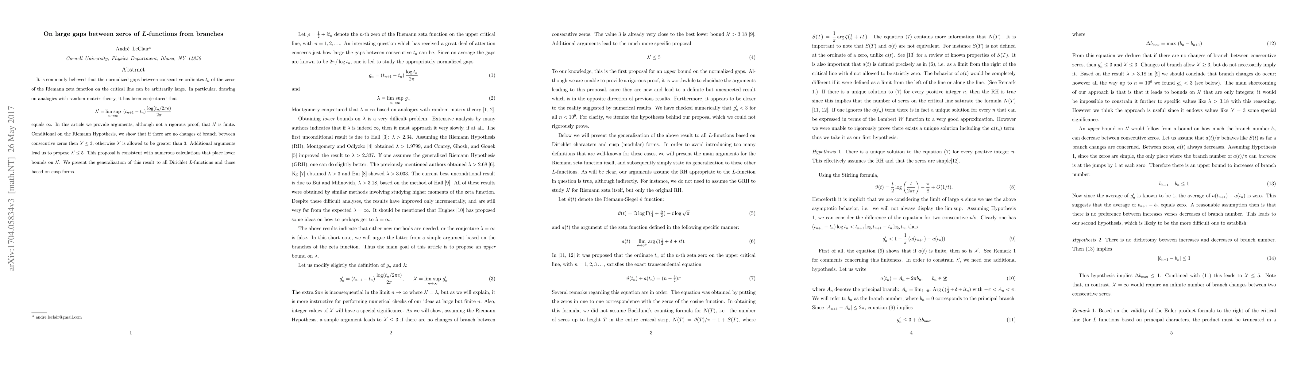 It is commonly believed that the normalized gaps between consecutive ordinates $t_n$ of the zeros of the Riemann zeta function on the critical line can be arbitrarily large. In particular, drawing on analogies with random matrix theory, it has been conjectured that $$\lambda' ={ lim ~ sup} ~( t_{n+1} - t_n ) \frac{ \log( t_n /2 \pi e)}{2\pi}$$ equals $\infty$. In this article we provide arguments, although not a rigorous proof, that $\lambda'$ is finite. Conditional on the Riemann Hypothesis, we show that if there are no changes of branch between consecutive zeros then $\lambda' \leq 3$, otherwise $\lambda'$ is allowed to be greater than $3$. Additional arguments lead us to propose $\lambda'\leq 5$. This proposal is consistent with numerous calculations that place lower bounds on $\lambda'$. We present the generalization of this result to all Dirichlet $L$-functions and those based on cusp forms.