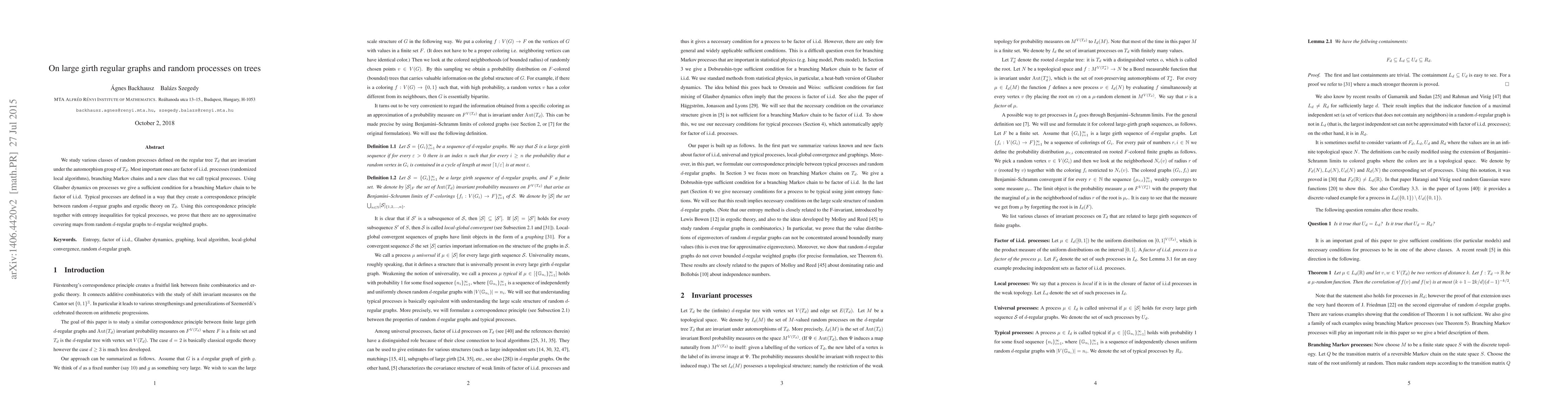 This paper explores random processes on the regular tree $T_d$, focusing on factor of i.i.d. processes, branching Markov chains, and a new class termed typical processes. It establishes a correspondence principle linking random $d$-regular graphs to ergodic theory, proving combinatorial results using entropy inequalities.