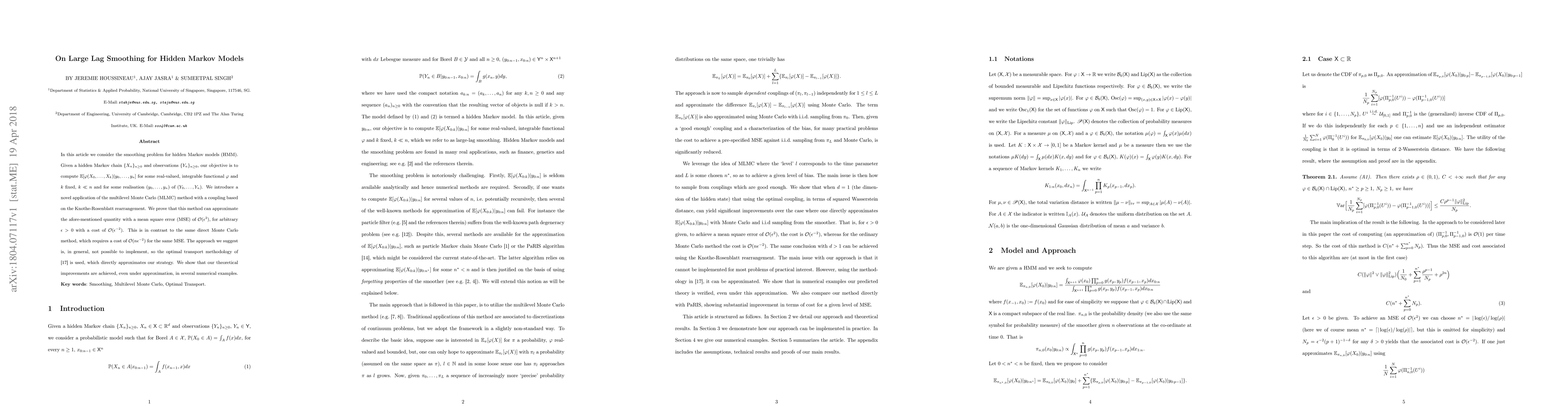 In this article we consider the smoothing problem for hidden Markov models (HMM). Given a hidden Markov chain $\{X_n\}_{n\geq 0}$ and observations $\{Y_n\}_{n\geq 0}$, our objective is to compute $\mathbb{E}[\varphi(X_0,\dots,X_k)|y_{0},\dots,y_n]$ for some real-valued, integrable functional $\varphi$ and $k$ fixed, $k \ll n$ and for some realisation $(y_0,\dots,y_n)$ of $(Y_0,\dots,Y_n)$. We introduce a novel application of the multilevel Monte Carlo (MLMC) method with a coupling based on the Knothe-Rosenblatt rearrangement. We prove that this method can approximate the afore-mentioned quantity with a mean square error (MSE) of $\mathcal{O}(\epsilon^2)$, for arbitrary $\epsilon>0$ with a cost of $\mathcal{O}(\epsilon^{-2})$. This is in contrast to the same direct Monte Carlo method, which requires a cost of $\mathcal{O}(n\epsilon^{-2})$ for the same MSE. The approach we suggest is, in general, not possible to implement, so the optimal transport methodology of \cite{span} is used, which directly approximates our strategy. We show that our theoretical improvements are achieved, even under approximation, in several numerical examples.