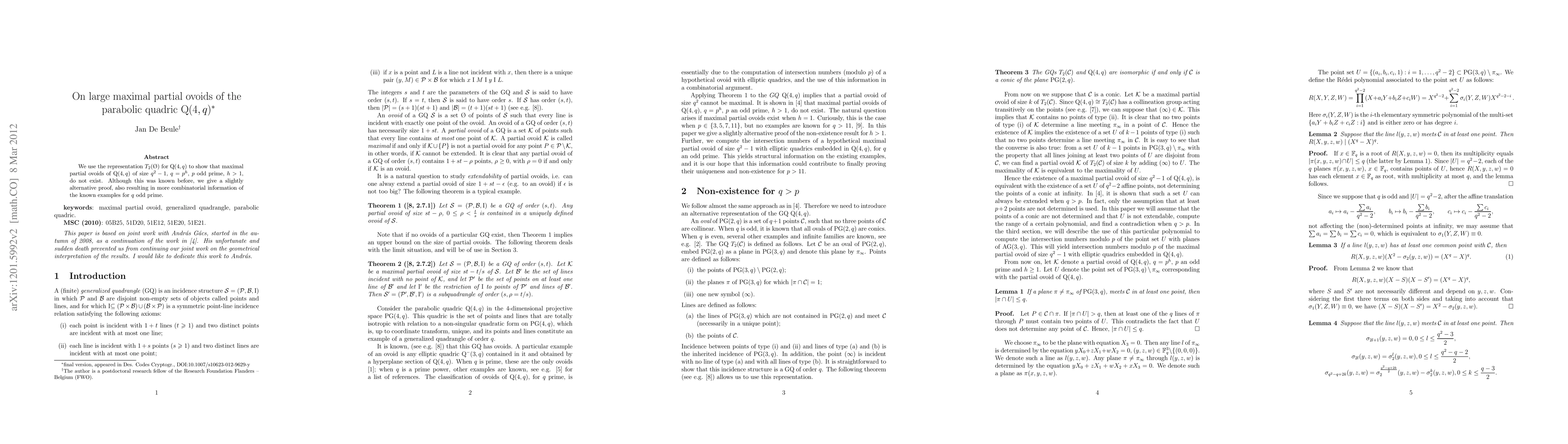The paper presents an alternative proof for the non-existence of maximal partial ovoids of size q^2-1 in Q(4,q), providing additional combinatorial insights.