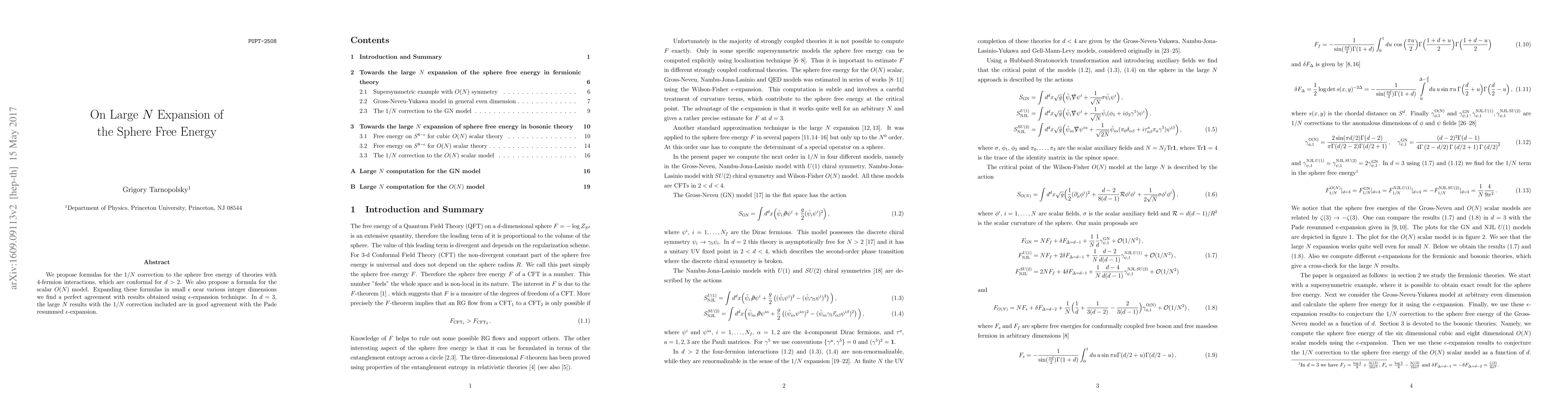 This paper proposes formulas for the $1/N$ correction to the sphere free energy in conformal theories with 4-fermion interactions, and for the scalar $O(N)$ model, showing agreement with $\epsilon$-expansion results and Pade resummed $\epsilon$-expansion in $d=3$. The large $N$ expansion is validated near various integer dimensions.
