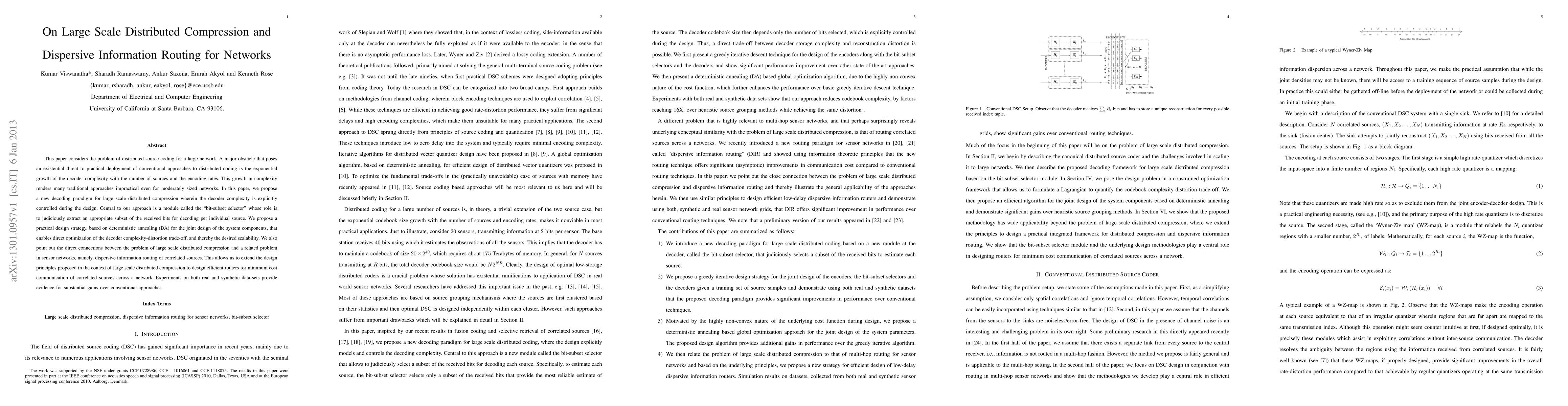 This paper proposes a new decoding paradigm for large scale distributed compression that controls decoder complexity through a "bit-subset selector" and a design strategy based on deterministic annealing, achieving scalability and efficiency in handling correlated sources. The approach also extends to designing efficient routers for dispersive information routing in sensor networks.