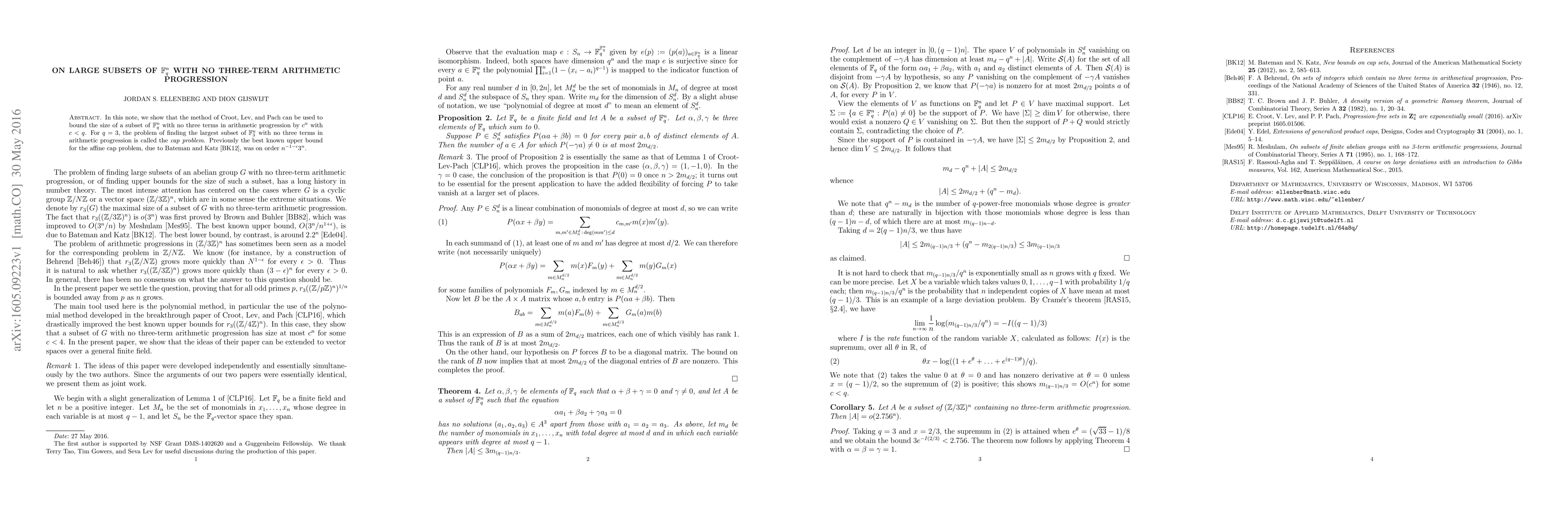 Researchers have improved a method to bound the size of subsets in $F_q^n$ with no three-term arithmetic progression, reaching an upper bound of $c^n$ where $c < q$, improving previous bounds for specific cases like the cap problem.