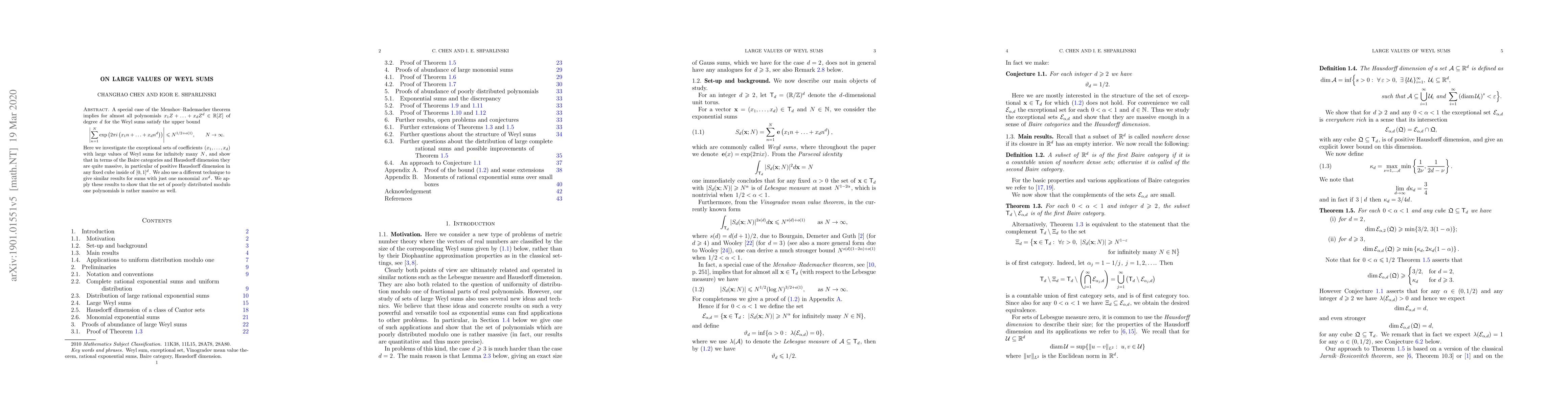 A special case of the Menshov--Rademacher theorem implies for almost all polynomials $x_1Z+\ldots +x_d Z^{d} \in {\mathbb R}[Z]$ of degree $d$ for the Weyl sums satisfy the upper bound $$ \left| \sum_{n=1}^{N}\exp\left(2\pi i \left(x_1 n+\ldots +x_d n^{d}\right)\right) \right| \leqslant N^{1/2+o(1)}, \qquad N\to \infty. $$ Here we investigate the exceptional sets of coefficients $(x_1, \ldots, x_d)$ with large values of Weyl sums for infinitely many $N$, and show that in terms of the Baire categories and Hausdorff dimension they are quite massive, in particular of positive Hausdorff dimension in any fixed cube inside of $[0,1]^d$. We also use a different technique to give similar results for sums with just one monomial $xn^d$. We apply these results to show that the set of poorly distributed modulo one polynomials is rather massive as well.