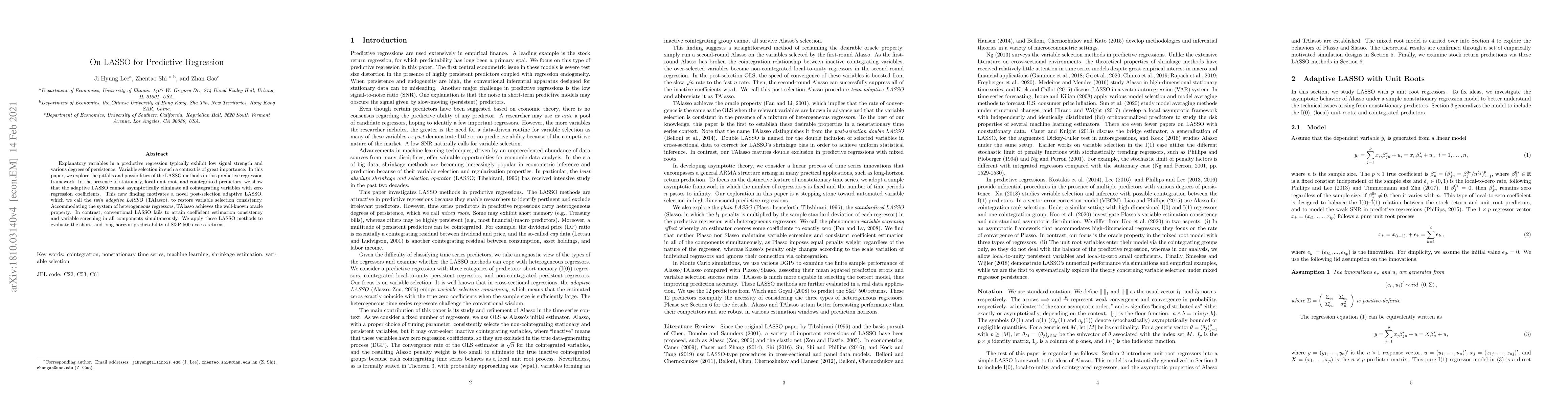 Explanatory variables in a predictive regression typically exhibit low signal strength and various degrees of persistence. Variable selection in such a context is of great importance. In this paper, we explore the pitfalls and possibilities of the LASSO methods in this predictive regression framework. In the presence of stationary, local unit root, and cointegrated predictors, we show that the adaptive LASSO cannot asymptotically eliminate all cointegrating variables with zero regression coefficients. This new finding motivates a novel post-selection adaptive LASSO, which we call the twin adaptive LASSO (TAlasso), to restore variable selection consistency. Accommodating the system of heterogeneous regressors, TAlasso achieves the well-known oracle property. In contrast, conventional LASSO fails to attain coefficient estimation consistency and variable screening in all components simultaneously. We apply these LASSO methods to evaluate the short- and long-horizon predictability of S\&P 500 excess returns.