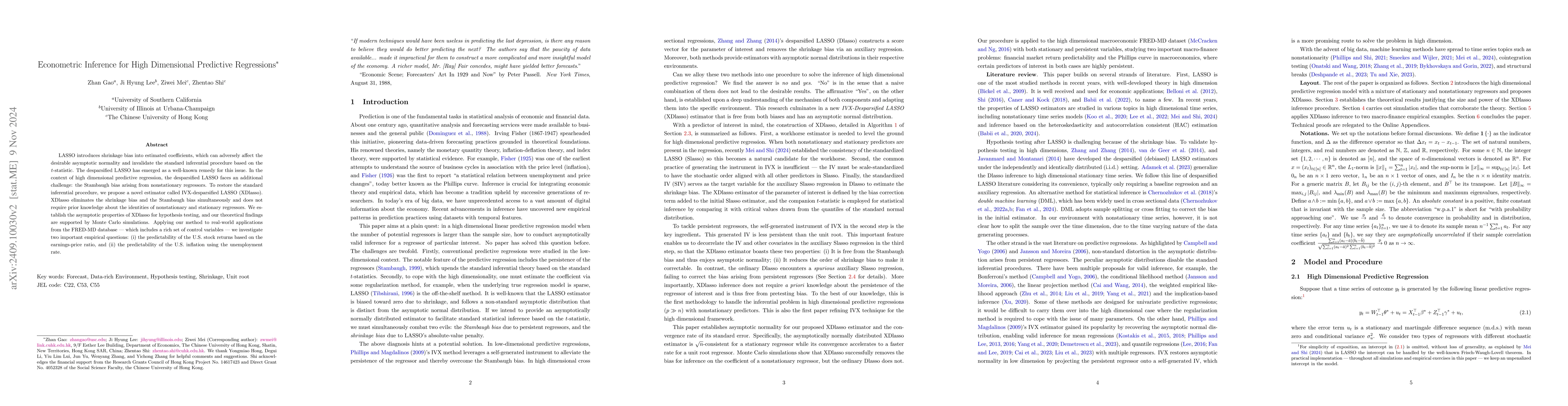 LASSO introduces shrinkage bias into estimated coefficients, which can adversely affect the desirable asymptotic normality and invalidate the standard inferential procedure based on the $t$-statistic. The desparsified LASSO has emerged as a well-known remedy for this issue. In the context of high dimensional predictive regression, the desparsified LASSO faces an additional challenge: the Stambaugh bias arising from nonstationary regressors. To restore the standard inferential procedure, we propose a novel estimator called IVX-desparsified LASSO (XDlasso). XDlasso eliminates the shrinkage bias and the Stambaugh bias simultaneously and does not require prior knowledge about the identities of nonstationary and stationary regressors. We establish the asymptotic properties of XDlasso for hypothesis testing, and our theoretical findings are supported by Monte Carlo simulations. Applying our method to real-world applications from the FRED-MD database -- which includes a rich set of control variables -- we investigate two important empirical questions: (i) the predictability of the U.S. stock returns based on the earnings-price ratio, and (ii) the predictability of the U.S. inflation using the unemployment rate.