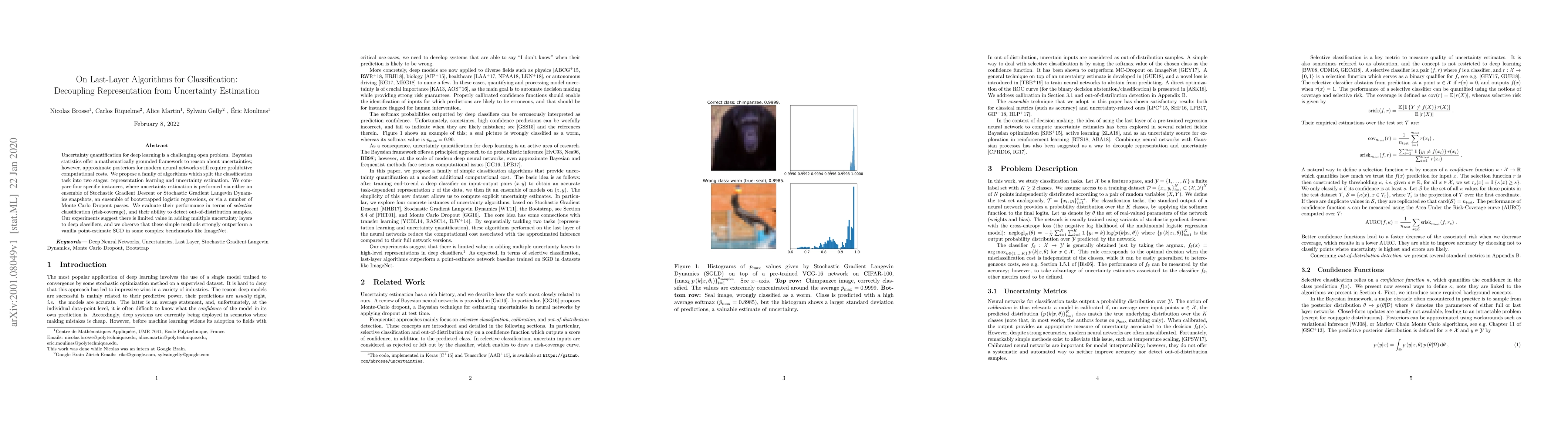 Uncertainty quantification for deep learning is a challenging open problem. Bayesian statistics offer a mathematically grounded framework to reason about uncertainties; however, approximate posteriors for modern neural networks still require prohibitive computational costs. We propose a family of algorithms which split the classification task into two stages: representation learning and uncertainty estimation. We compare four specific instances, where uncertainty estimation is performed via either an ensemble of Stochastic Gradient Descent or Stochastic Gradient Langevin Dynamics snapshots, an ensemble of bootstrapped logistic regressions, or via a number of Monte Carlo Dropout passes. We evaluate their performance in terms of \emph{selective} classification (risk-coverage), and their ability to detect out-of-distribution samples. Our experiments suggest there is limited value in adding multiple uncertainty layers to deep classifiers, and we observe that these simple methods strongly outperform a vanilla point-estimate SGD in some complex benchmarks like ImageNet.