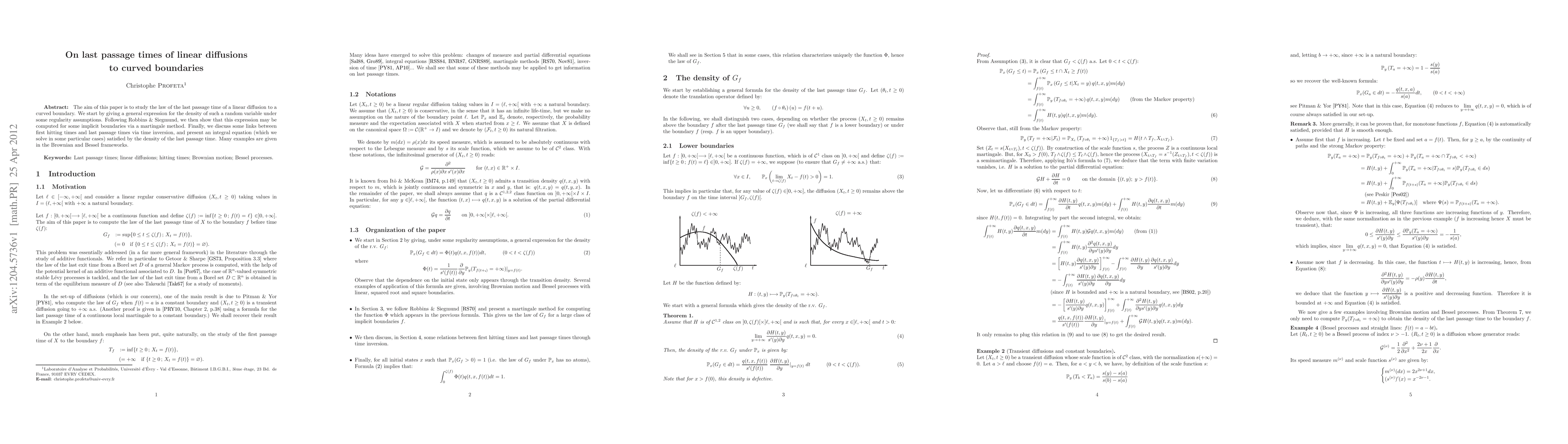 This paper investigates the last passage time of linear diffusions to curved boundaries, deriving a general density expression and demonstrating its computation via a martingale method. It also explores connections between first and last passage times and solves an integral equation for specific cases, illustrated with examples in Brownian and Bessel processes.