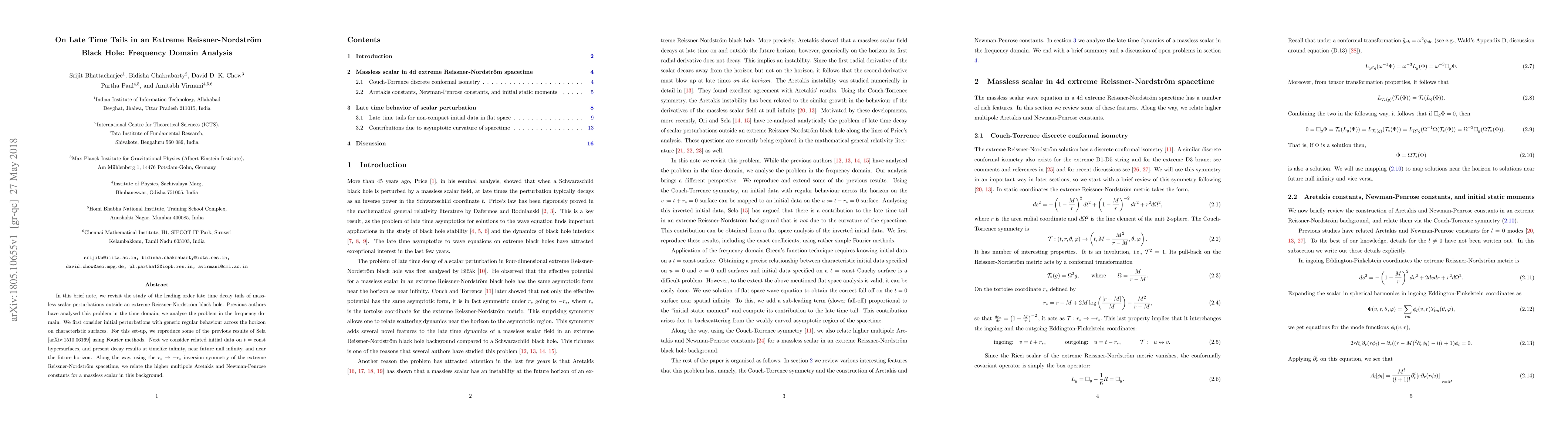 This paper analyzes the late time decay of massless scalar perturbations outside an extreme Reissner-Nordström black hole using frequency domain methods, comparing results with previous time domain studies and providing new decay results at various infinities. It also leverages inversion symmetry to relate higher multipole constants for these perturbations.