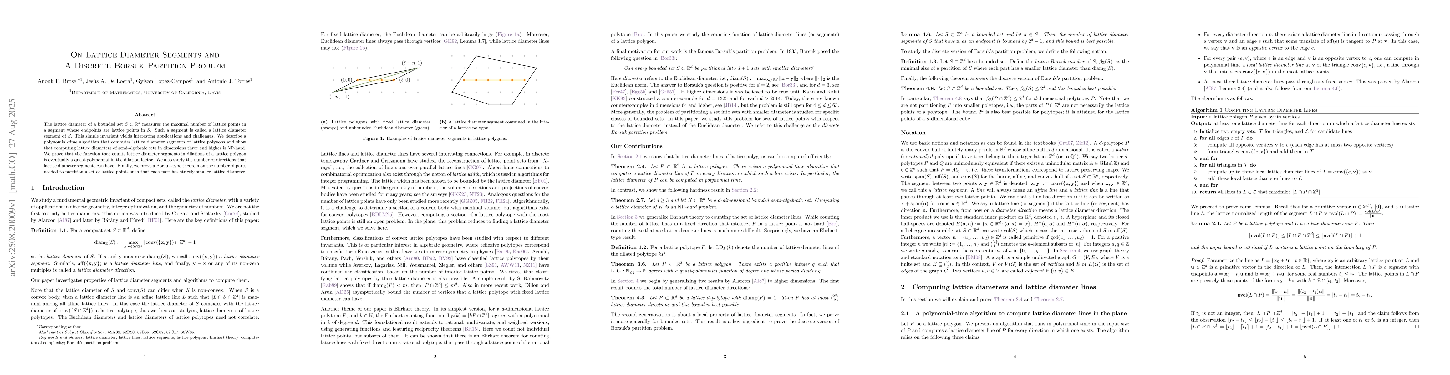 The lattice diameter of a bounded set $S \subset \mathbb{R}^d$ measures the maximal number of lattice points in a segment whose endpoints are lattice points in $S$. Such a segment is called a lattice diameter segment of $S$. This simple invariant yields interesting applications and challenges. We describe a polynomial-time algorithm that computes lattice diameter segments of lattice polygons and show that computing lattice diameters of semi-algebraic sets in dimensions three and higher is NP-hard. We prove that the function that counts lattice diameter segments in dilations of a lattice polygon is eventually a quasi-polynomial in the dilation factor. We also study the number of directions that lattice diameter segments can have. Finally, we prove a Borsuk-type theorem on the number of parts needed to partition a set of lattice points such that each part has strictly smaller lattice diameter.