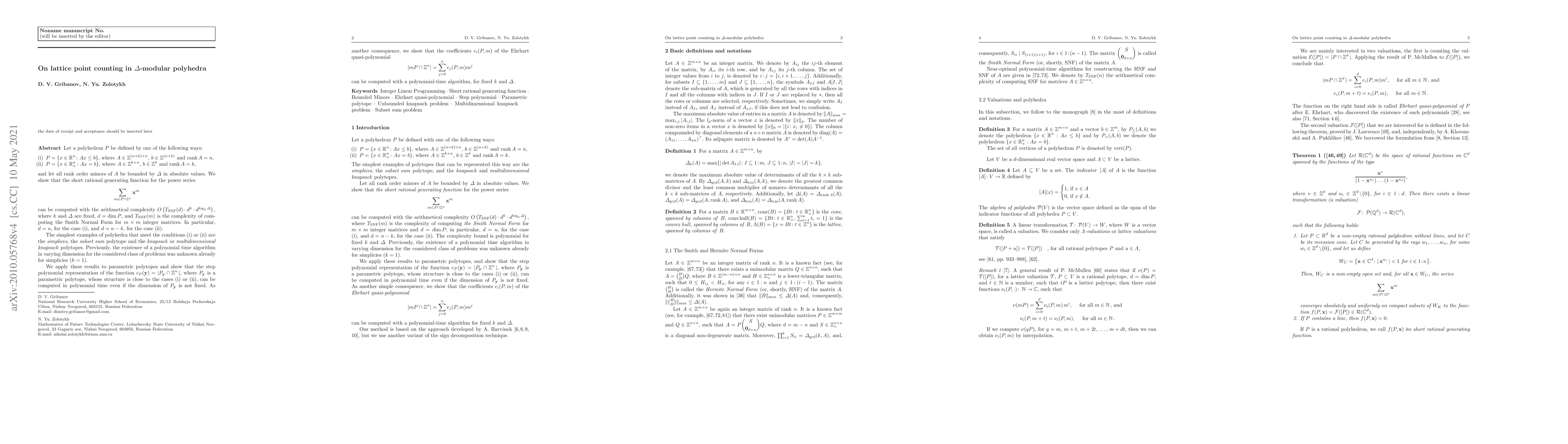 Let a polyhedron $P$ be defined by one of the following ways: (i) $P = \{x \in R^n \colon A x \leq b\}$, where $A \in Z^{(n+k) \times n}$, $b \in Z^{(n+k)}$ and $rank\, A = n$; (ii) $P = \{x \in R_+^n \colon A x = b\}$, where $A \in Z^{k \times n}$, $b \in Z^{k}$ and $rank\, A = k$. And let all rank order minors of $A$ be bounded by $\Delta$ in absolute values. We show that the short rational generating function for the power series $$ \sum\limits_{m \in P \cap Z^n} x^m $$ can be computed with the arithmetic complexity $ O\left(T_{SNF}(d) \cdot d^{k} \cdot d^{\log_2 \Delta}\right), $ where $k$ and $\Delta$ are fixed, $d = \dim P$, and $T_{SNF}(m)$ is the complexity to compute the Smith Normal Form for $m \times m$ integer matrix. In particular, $d = n$ for the case (i) and $d = n-k$ for the case (ii). The simplest examples of polyhedra that meet conditions (i) or (ii) are the simplicies, the subset sum polytope and the knapsack or multidimensional knapsack polytopes. We apply these results to parametric polytopes, and show that the step polynomial representation of the function $c_P(y) = |P_{y} \cap Z^n|$, where $P_{y}$ is parametric polytope, can be computed by a polynomial time even in varying dimension if $P_{y}$ has a close structure to the cases (i) or (ii). As another consequence, we show that the coefficients $e_i(P,m)$ of the Ehrhart quasi-polynomial $$ \left| mP \cap Z^n\right| = \sum\limits_{j = 0}^n e_i(P,m)m^j $$ can be computed by a polynomial time algorithm for fixed $k$ and $\Delta$.