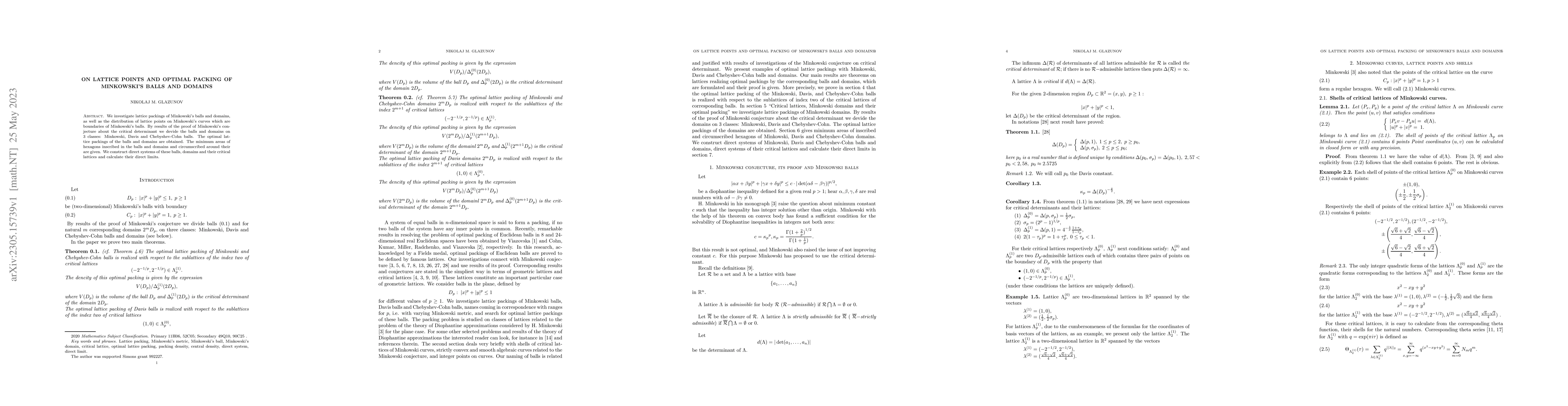 This paper explores lattice packings of Minkowski's balls and domains, classifying them into Minkowski, Davis, and Chebyshev-Cohn types based on the critical determinant. It also determines the optimal packings and calculates the minimum areas of inscribed and circumscribed hexagons, along with constructing direct systems and calculating their limits.