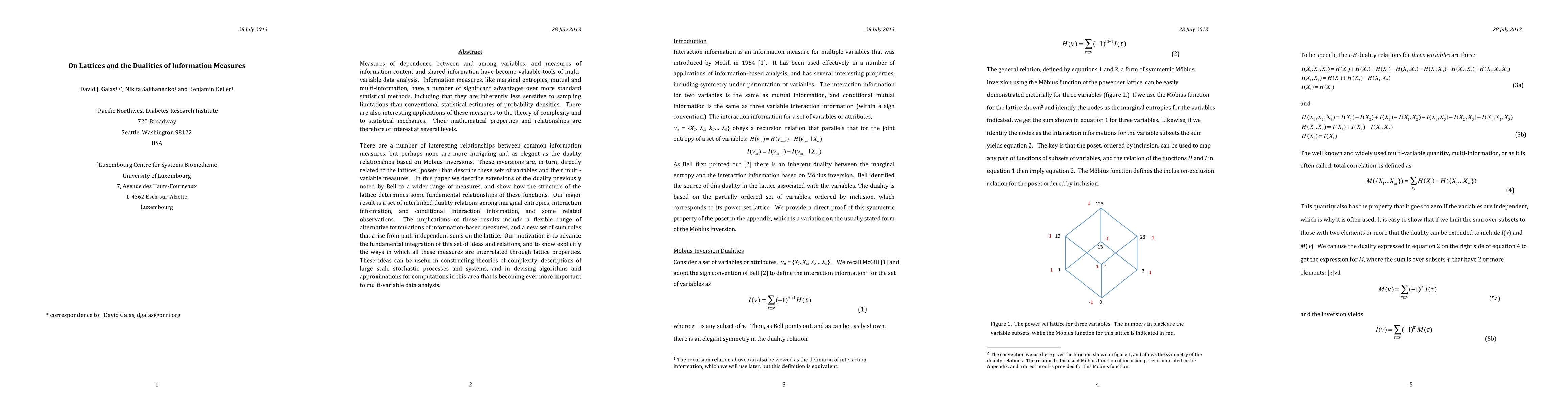 Measures of dependence among variables, and measures of information content and shared information have become valuable tools of multi-variable data analysis. Information measures, like marginal entropies, mutual and multi-information, have a number of significant advantages over more standard statistical methods, like their reduced sensitivity to sampling limitations than statistical estimates of probability densities. There are also interesting applications of these measures to the theory of complexity and to statistical mechanics. Their mathematical properties and relationships are therefore of interest at several levels. Of the interesting relationships between common information measures, perhaps none are more intriguing and as elegant as the duality relationships based on Mobius inversions. These inversions are directly related to the lattices (posets) that describe these sets of variables and their multi-variable measures. In this paper we describe extensions of the duality previously noted by Bell to a range of measures, and show how the structure of the lattice determines fundamental relationships of these functions. Our major result is a set of interlinked duality relations among marginal entropies, interaction information, and conditional interaction information. The implications of these results include a flexible range of alternative formulations of information-based measures, and a new set of sum rules that arise from path-independent sums on the lattice. Our motivation is to advance the fundamental integration of this set of ideas and relations, and to show explicitly the ways in which all these measures are interrelated through lattice properties. These ideas can be useful in constructing theories of complexity, descriptions of large scale stochastic processes and systems, and in devising algorithms and approximations for computations in multi-variable data analysis.
