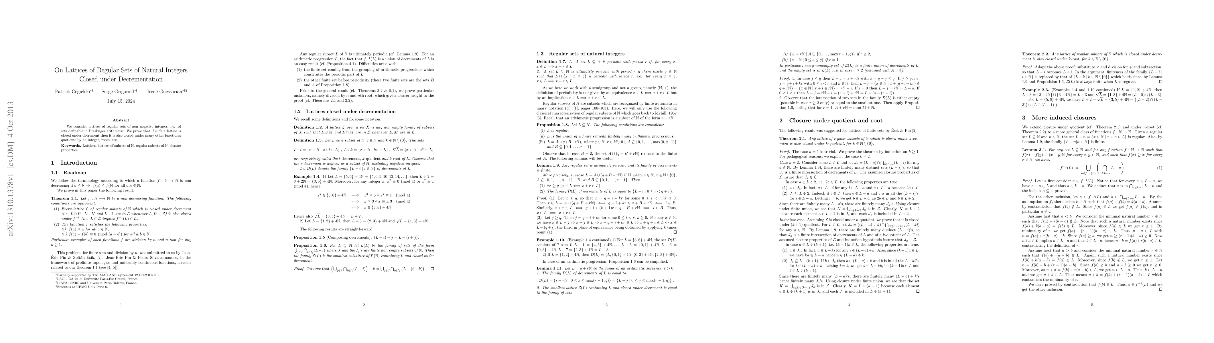 Summary: This paper explores lattices of regular sets of non-negative integers definable in Presburger arithmetic, proving that if these lattices are closed under decrement, they are also closed under additional operations like quotients and roots.