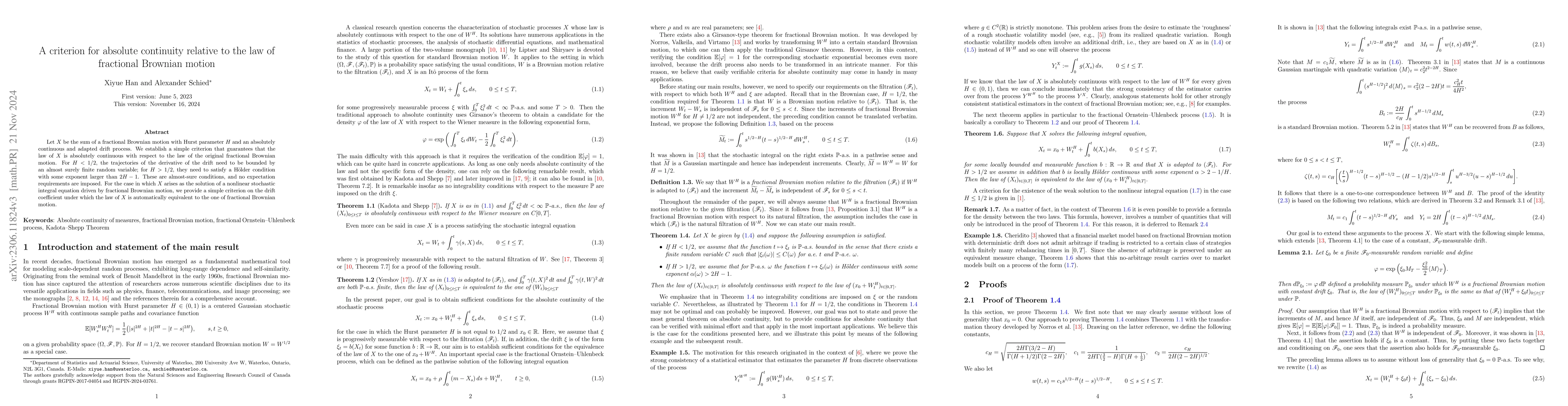 This paper establishes a criterion for the law of a stochastic process $X$, which is the sum of fractional Brownian motion and an adapted drift, to be absolutely continuous with respect to the original fractional Brownian motion. The conditions depend on the Hurst parameter $H$: bounded trajectories for $H<1/2$ and a H\"older condition for $H>1/2$.