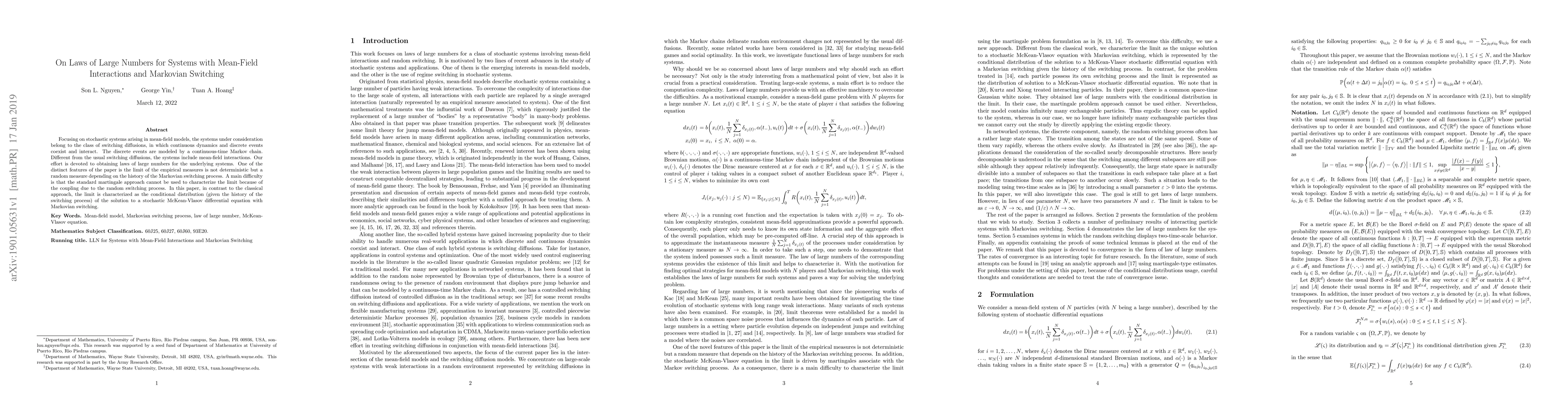 Focusing on stochastic systems arising in mean-field models, the systems under consideration belong to the class of switching diffusions, in which continuous dynamics and discrete events coexist and interact. The discrete events are modeled by a continuous-time Markov chain. Different from the usual switching diffusions, the systems include mean-field interactions. Our effort is devoted to obtaining laws of large numbers for the underlying systems. One of the distinct features of the paper is the limit of the empirical measures is not deterministic but a random measure depending on the history of the Markovian switching process. A main difficulty is that the standard martingale approach cannot be used to characterize the limit because of the coupling due to the random switching process. In this paper, in contrast to the classical approach, the limit is characterized as the conditional distribution (given the history of the switching process) of the solution to a stochastic McKean-Vlasov differential equation with Markovian switching.