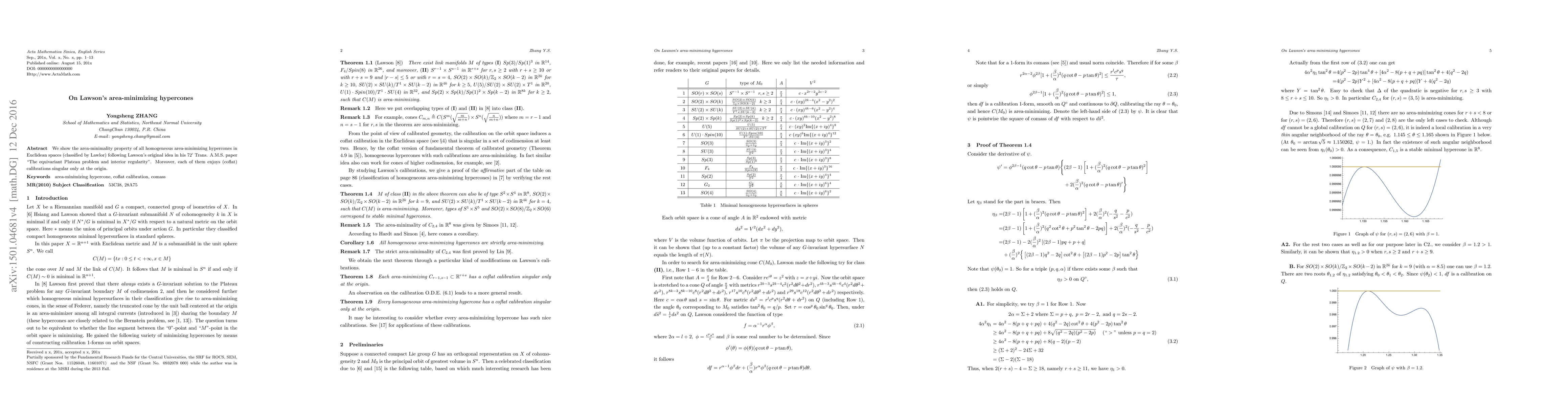 This paper demonstrates the area-minimality of homogeneous area-minimizing hypercones in Euclidean spaces, as originally proposed by Lawson, and shows that these hypercones possess calibrations that are singular only at the origin.