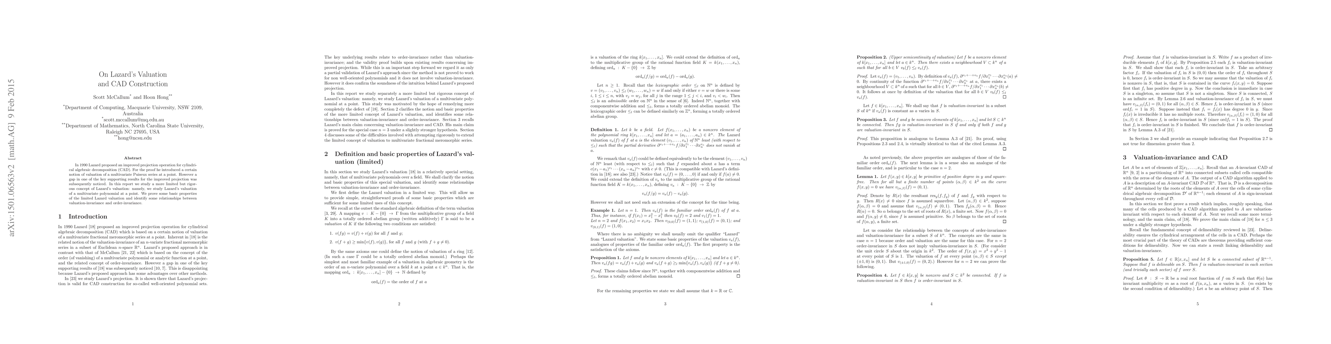 In 1990 Lazard proposed an improved projection operation for cylindrical algebraic decomposition (CAD). For the proof he introduced a certain notion of valuation of a multivariate Puiseux series at a point. However a gap in one of the key supporting results for the improved projection was subsequently noticed. In this report we study a more limited but rigorous concept of Lazard's valuation: namely, we study Lazard's valuation of a multivariate polynomial at a point. We prove some basic properties of the limited Lazard valuation and identify some relationships between valuation-invariance and order-invariance.