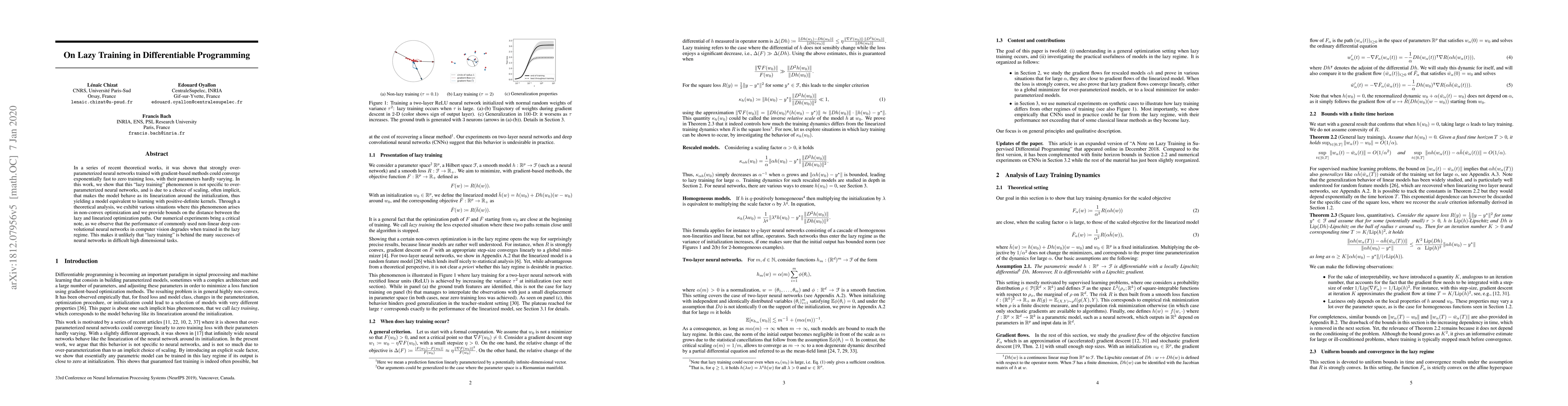 In a series of recent theoretical works, it was shown that strongly over-parameterized neural networks trained with gradient-based methods could converge exponentially fast to zero training loss, with their parameters hardly varying. In this work, we show that this "lazy training" phenomenon is not specific to over-parameterized neural networks, and is due to a choice of scaling, often implicit, that makes the model behave as its linearization around the initialization, thus yielding a model equivalent to learning with positive-definite kernels. Through a theoretical analysis, we exhibit various situations where this phenomenon arises in non-convex optimization and we provide bounds on the distance between the lazy and linearized optimization paths. Our numerical experiments bring a critical note, as we observe that the performance of commonly used non-linear deep convolutional neural networks in computer vision degrades when trained in the lazy regime. This makes it unlikely that "lazy training" is behind the many successes of neural networks in difficult high dimensional tasks.