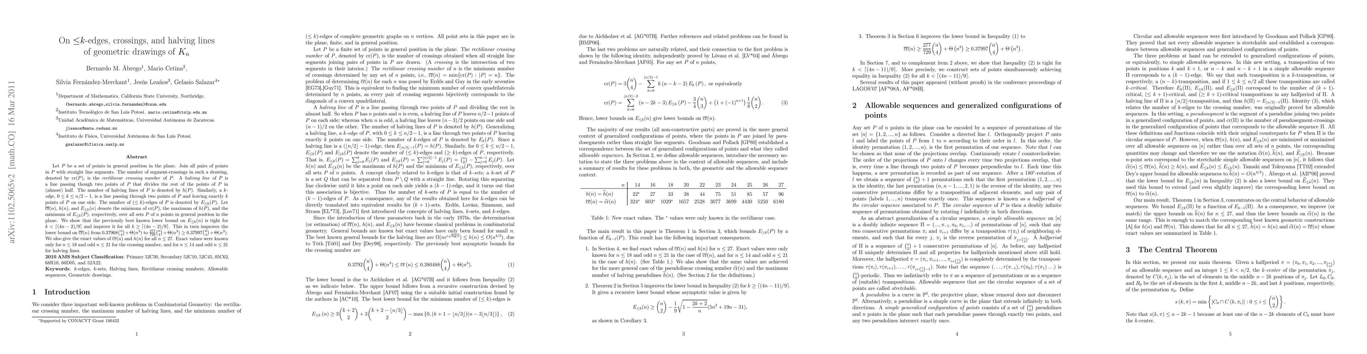 This paper investigates geometric drawings of complete graphs $K_n$ and focuses on the rectilinear crossing number, halving lines, and $(\le k)$-edges. The authors demonstrate that the best-known lower bound for $(\le k)$-edges is tight for small $k$ and improve it for larger $k$, which in turn enhances the lower bound for the rectilinear crossing number. Additionally, they provide exact values for the crossing number and halving lines for all $n \leq 27$.