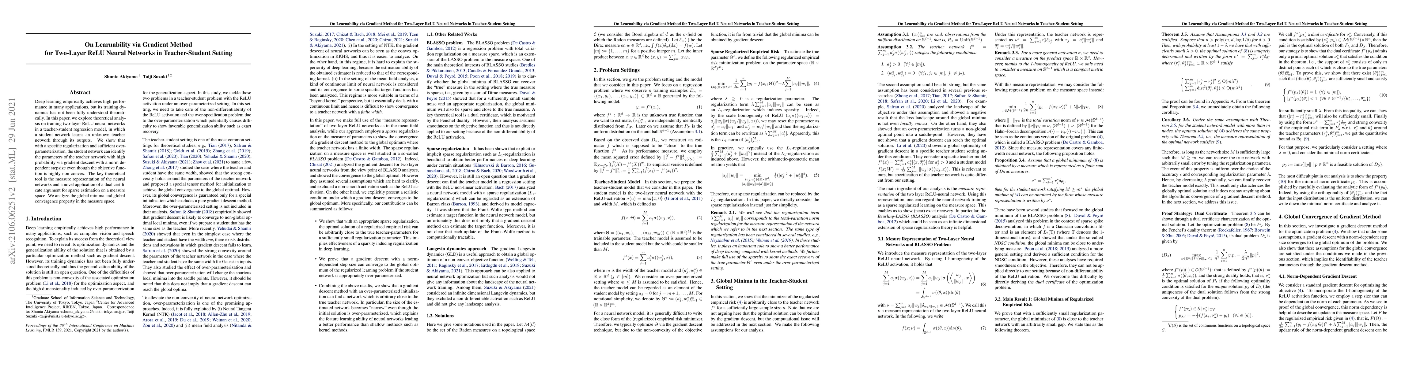 Deep learning empirically achieves high performance in many applications, but its training dynamics has not been fully understood theoretically. In this paper, we explore theoretical analysis on training two-layer ReLU neural networks in a teacher-student regression model, in which a student network learns an unknown teacher network through its outputs. We show that with a specific regularization and sufficient over-parameterization, the student network can identify the parameters of the teacher network with high probability via gradient descent with a norm dependent stepsize even though the objective function is highly non-convex. The key theoretical tool is the measure representation of the neural networks and a novel application of a dual certificate argument for sparse estimation on a measure space. We analyze the global minima and global convergence property in the measure space.