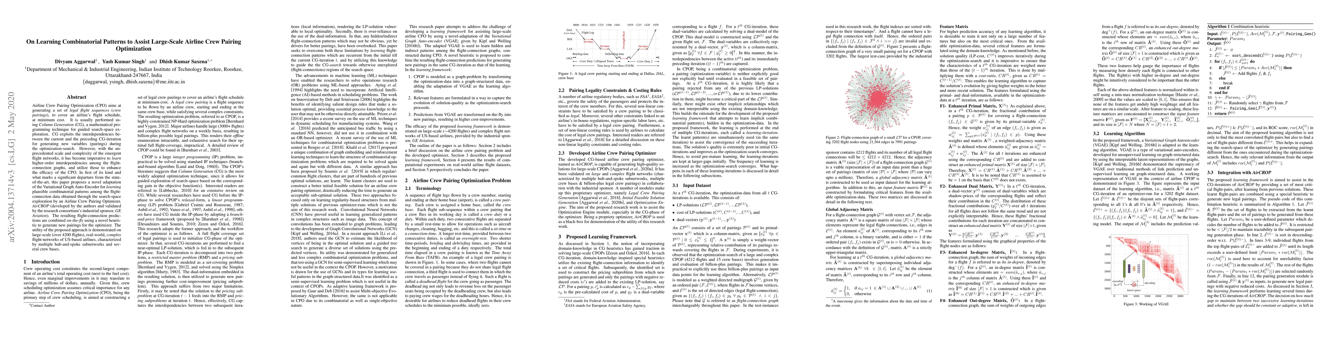 This paper proposes a novel Variational Graph Auto-Encoder adaptation to learn combinatorial patterns in airline crew pairing optimization, enhancing the efficiency of the AirCROP optimizer. The approach generates new flight pairings by predicting flight connections, demonstrated on large-scale, complex US airline networks.