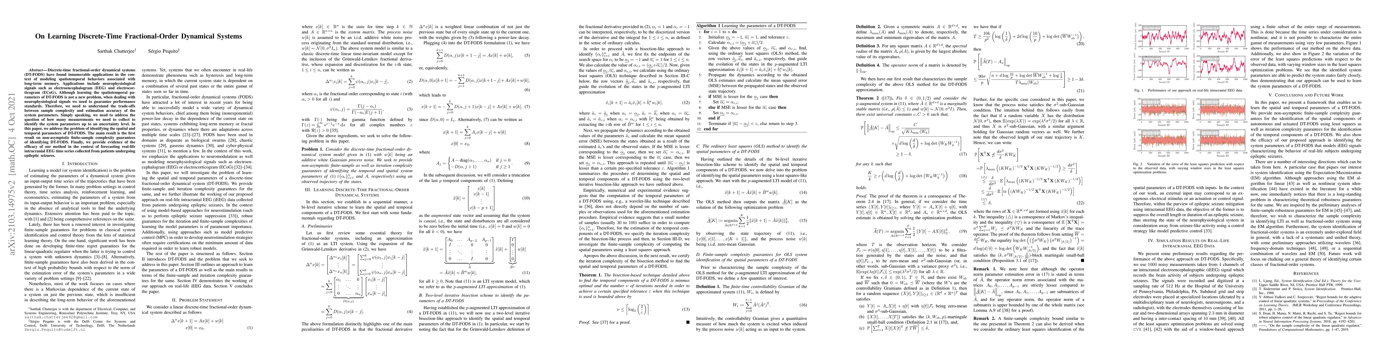 Discrete-time fractional-order dynamical systems (DT-FODS) have found innumerable applications in the context of modeling spatiotemporal behaviors associated with long-term memory. Applications include neurophysiological signals such as electroencephalogram (EEG) and electrocorticogram (ECoG). Although learning the spatiotemporal parameters of DT-FODS is not a new problem, when dealing with neurophysiological signals we need to guarantee performance standards. Therefore, we need to understand the trade-offs between sample complexity and estimation accuracy of the system parameters. Simply speaking, we need to address the question of how many measurements we need to collect to identify the system parameters up to an uncertainty level. In this paper, we address the problem of identifying the spatial and temporal parameters of DT-FODS. The main result is the first result on non-asymptotic finite-sample complexity guarantees of identifying DT-FODS. Finally, we provide evidence of the efficacy of our method in the context of forecasting real-life intracranial EEG time series collected from patients undergoing epileptic seizures.