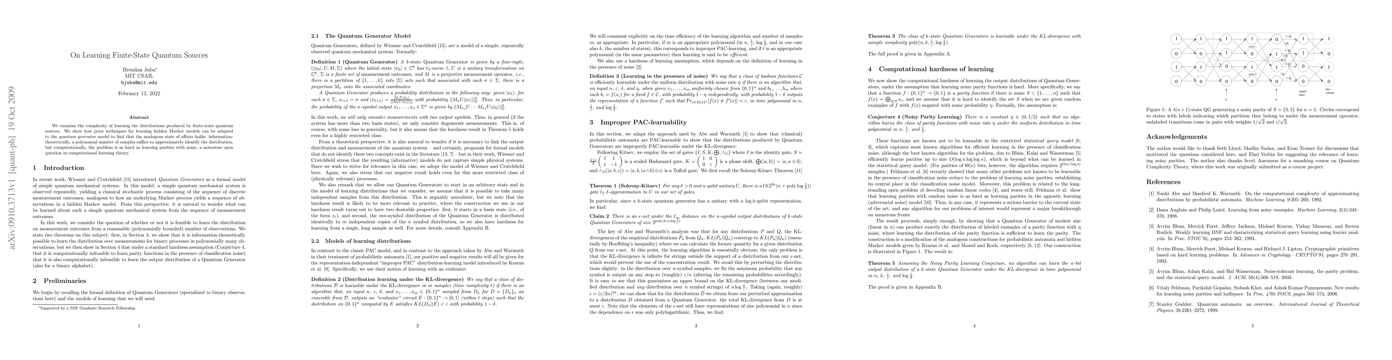 We examine the complexity of learning the distributions produced by finite-state quantum sources. We show how prior techniques for learning hidden Markov models can be adapted to the quantum generator model to find that the analogous state of affairs holds: information-theoretically, a polynomial number of samples suffice to approximately identify the distribution, but computationally, the problem is as hard as learning parities with noise, a notorious open question in computational learning theory.