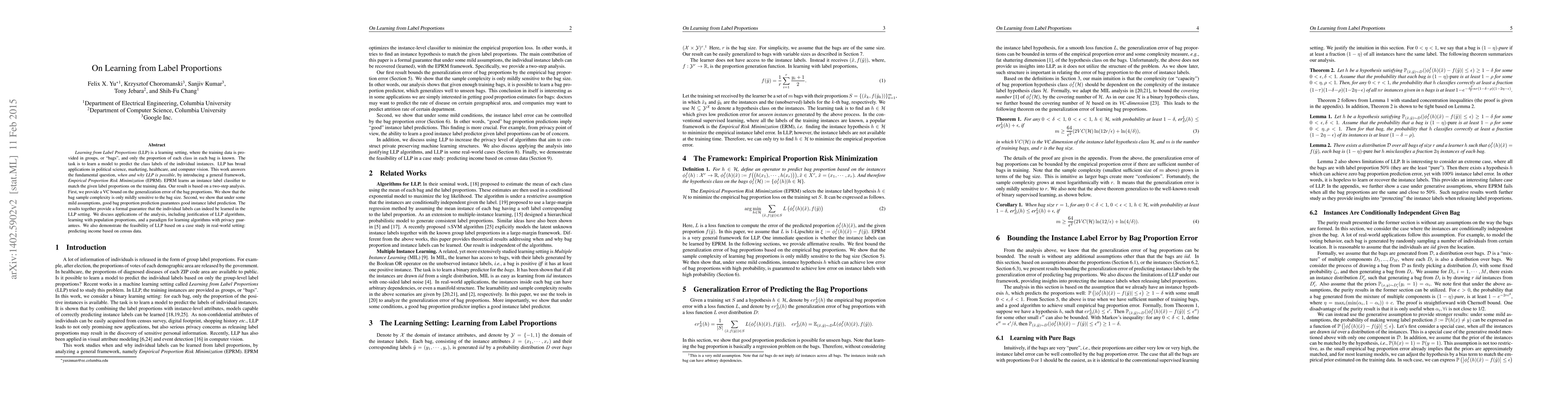 This paper explores the Learning from Label Proportions (LLP) framework, where only the proportion of each class in training bags is known. It introduces a general framework, Empirical Proportion Risk Minimization (EPRM), to predict individual instance labels, backed by a VC bound on generalization error and a two-step analysis showing that good bag proportion prediction correlates with good instance label prediction.