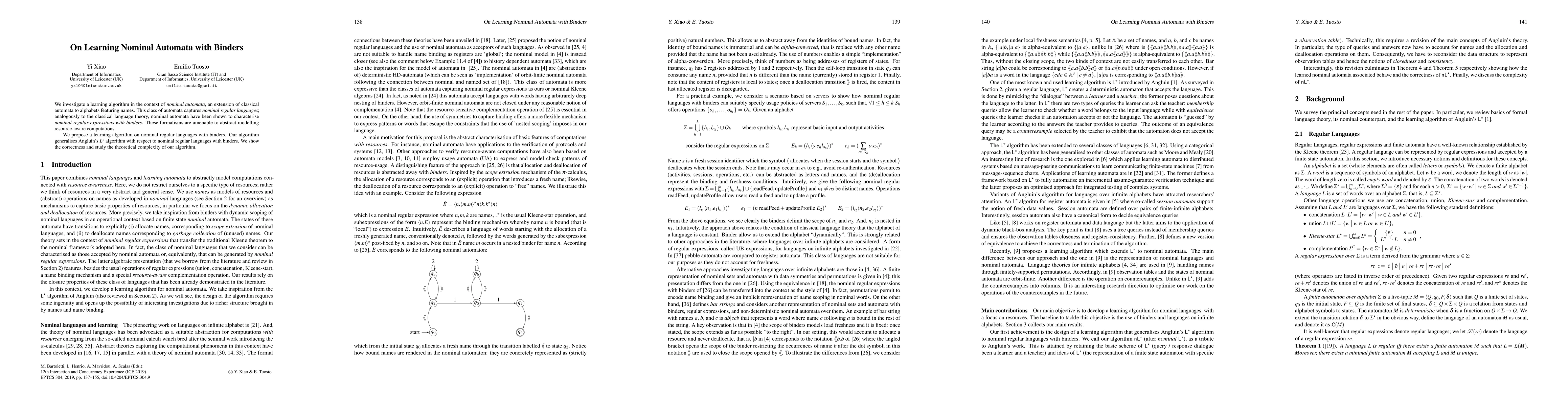 This paper proposes a learning algorithm for nominal automata that extend classical automata to handle names with binders, generalizing Angluin's L* algorithm. The authors demonstrate the correctness and analyze the theoretical complexity of their approach.