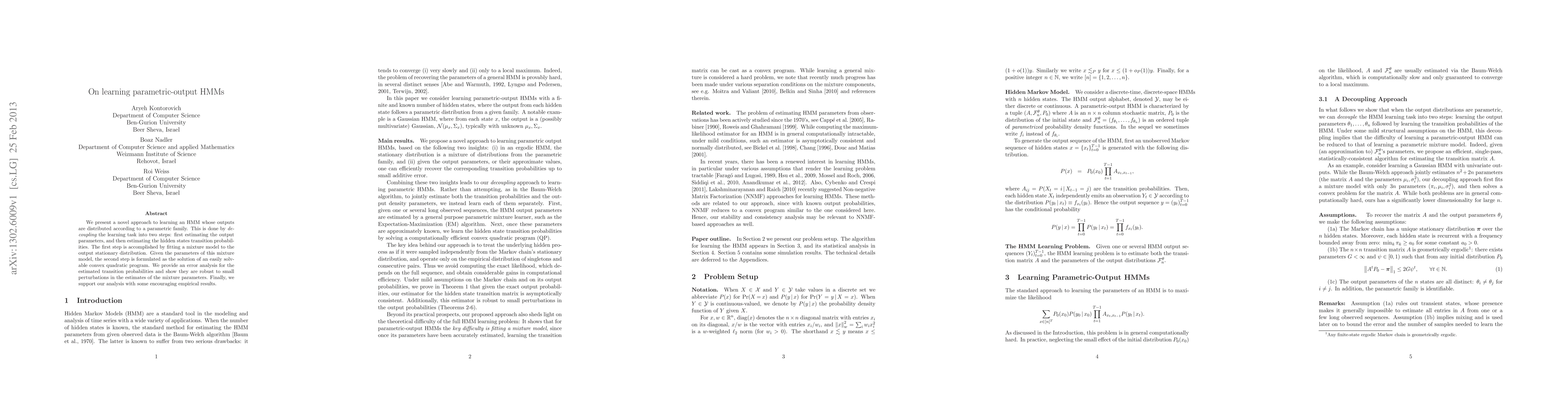 We present a novel approach for learning an HMM whose outputs are distributed according to a parametric family. This is done by {\em decoupling} the learning task into two steps: first estimating the output parameters, and then estimating the hidden states transition probabilities. The first step is accomplished by fitting a mixture model to the output stationary distribution. Given the parameters of this mixture model, the second step is formulated as the solution of an easily solvable convex quadratic program. We provide an error analysis for the estimated transition probabilities and show they are robust to small perturbations in the estimates of the mixture parameters. Finally, we support our analysis with some encouraging empirical results.