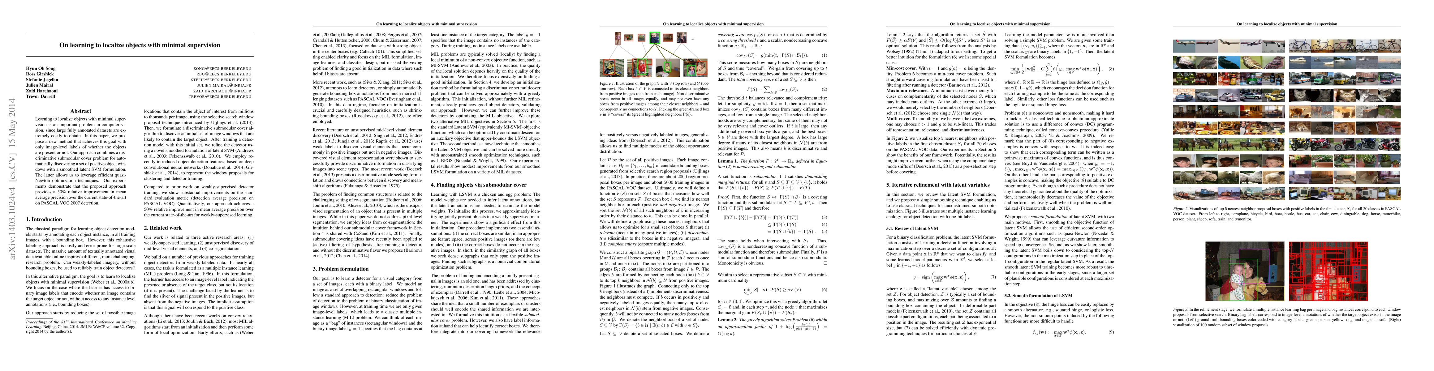This paper introduces a new method for object localization using minimal supervision, relying on image-level labels. It combines a discriminative submodular cover problem with a smoothed latent SVM, achieving a 50% relative improvement in mean average precision over existing methods on the PASCAL VOC 2007 dataset.