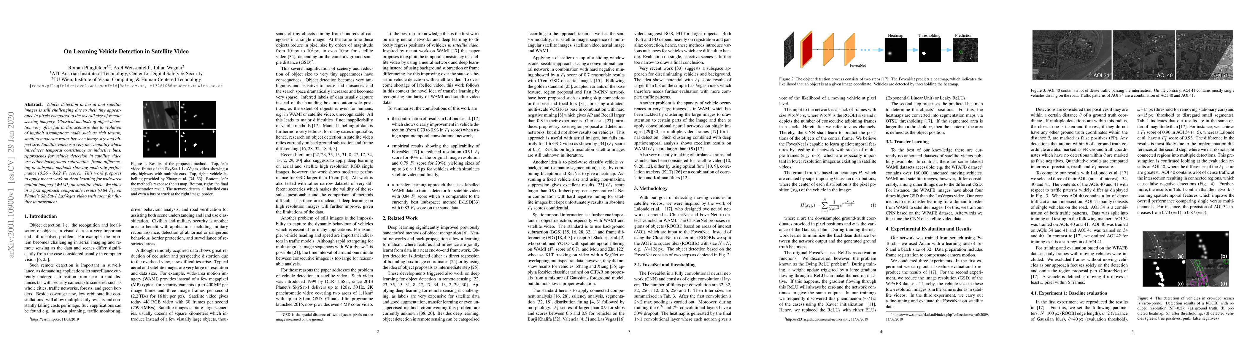 Vehicle detection in aerial and satellite images is still challenging due to their tiny appearance in pixels compared to the overall size of remote sensing imagery. Classical methods of object detection very often fail in this scenario due to violation of implicit assumptions made such as rich texture, small to moderate ratios between image size and object size. Satellite video is a very new modality which introduces temporal consistency as inductive bias. Approaches for vehicle detection in satellite video use either background subtraction, frame differencing or subspace methods showing moderate performance (0.26 - 0.82 $F_1$ score). This work proposes to apply recent work on deep learning for wide-area motion imagery (WAMI) on satellite video. We show in a first approach comparable results (0.84 $F_1$) on Planet's SkySat-1 LasVegas video with room for further improvement.