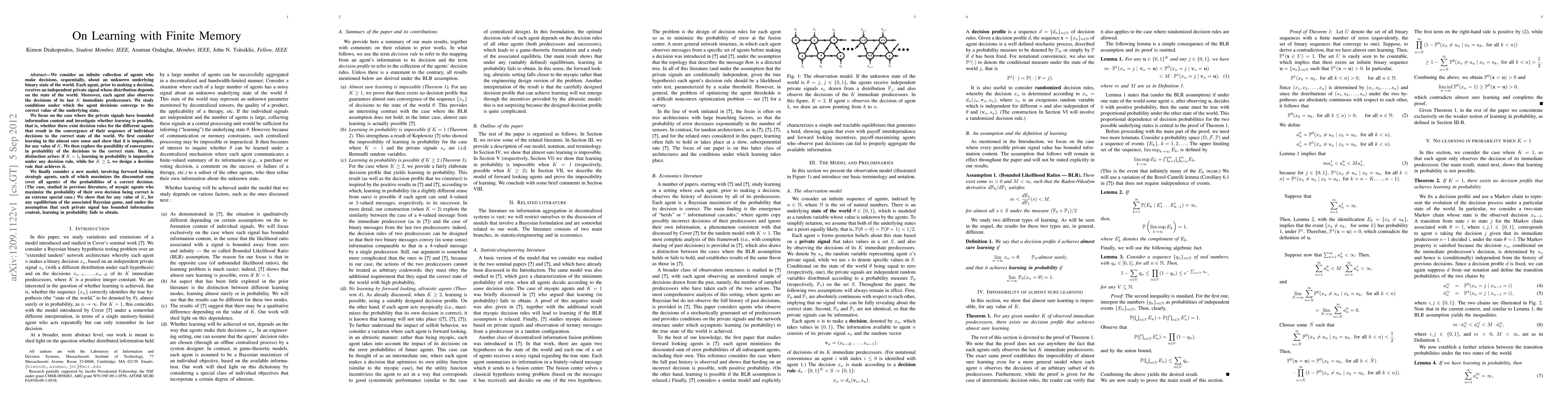 We consider an infinite collection of agents who make decisions, sequentially, about an unknown underlying binary state of the world. Each agent, prior to making a decision, receives an independent private signal whose distribution depends on the state of the world. Moreover, each agent also observes the decisions of its last K immediate predecessors. We study conditions under which the agent decisions converge to the correct value of the underlying state. We focus on the case where the private signals have bounded information content and investigate whether learning is possible, that is, whether there exist decision rules for the different agents that result in the convergence of their sequence of individual decisions to the correct state of the world. We first consider learning in the almost sure sense and show that it is impossible, for any value of K. We then explore the possibility of convergence in probability of the decisions to the correct state. Here, a distinction arises: if K equals 1, learning in probability is impossible under any decision rule, while for K greater or equal to 2, we design a decision rule that achieves it. We finally consider a new model, involving forward looking strategic agents, each of which maximizes the discounted sum (over all agents) of the probabilities of a correct decision. (The case, studied in previous literature, of myopic agents who maximize the probability of their own decision being correct is an extreme special case.) We show that for any value of K, for any equilibrium of the associated Bayesian game, and under the assumption that each private signal has bounded information content, learning in probability fails to obtain.